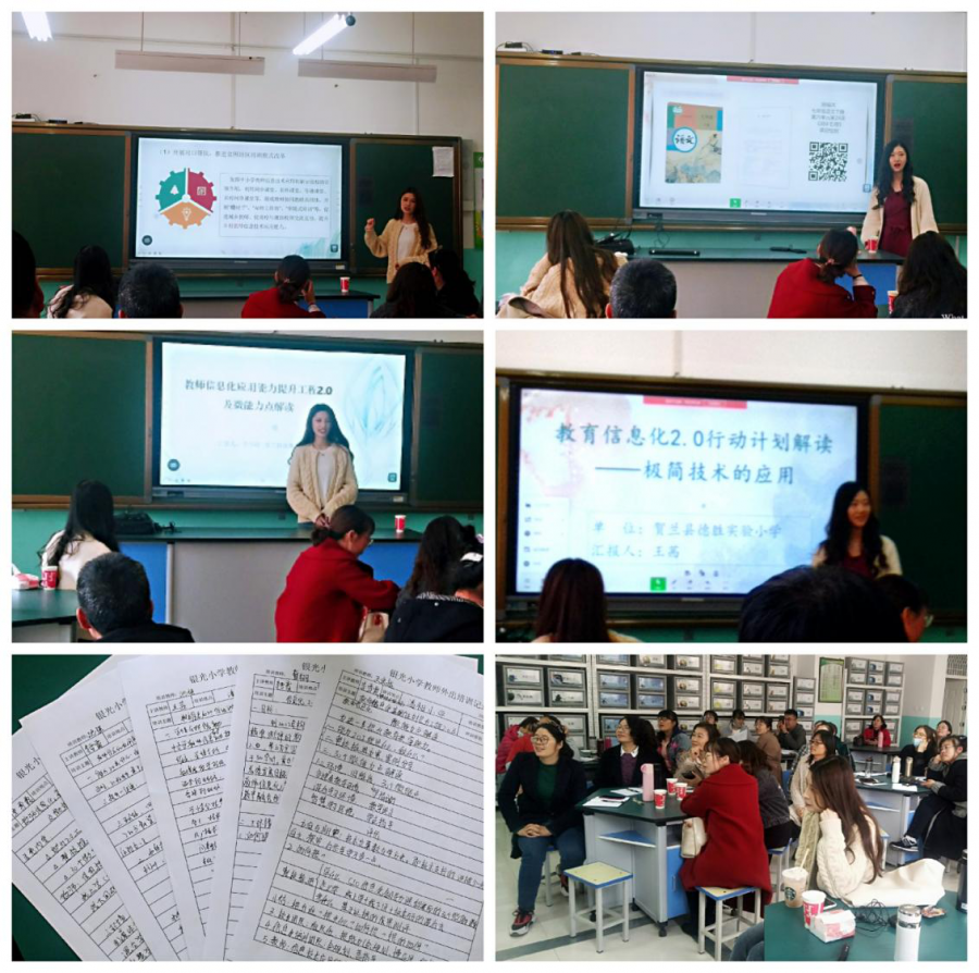 本次培训由贺兰县德胜实验小学教师李雪霞及王茜老师主讲。李老师就教育信息化能力2.0工程是什么?做什么?整校推进方案,案例分享以及30个微能力点解读三个方面内容进行了详细讲解,让我们对此次培训的目的有了清晰的认识,也加深了大家对30项微能力点有了更深入的理解。紧接着,王茜老师以轻松幽默的口吻,针对“教育信息化2.0行动计划解读—极简技术的应用”,以详实的例子充分互动交流,图片、软件、视频等快捷工具给在座教师的工作带来便利,大家连连称赞。