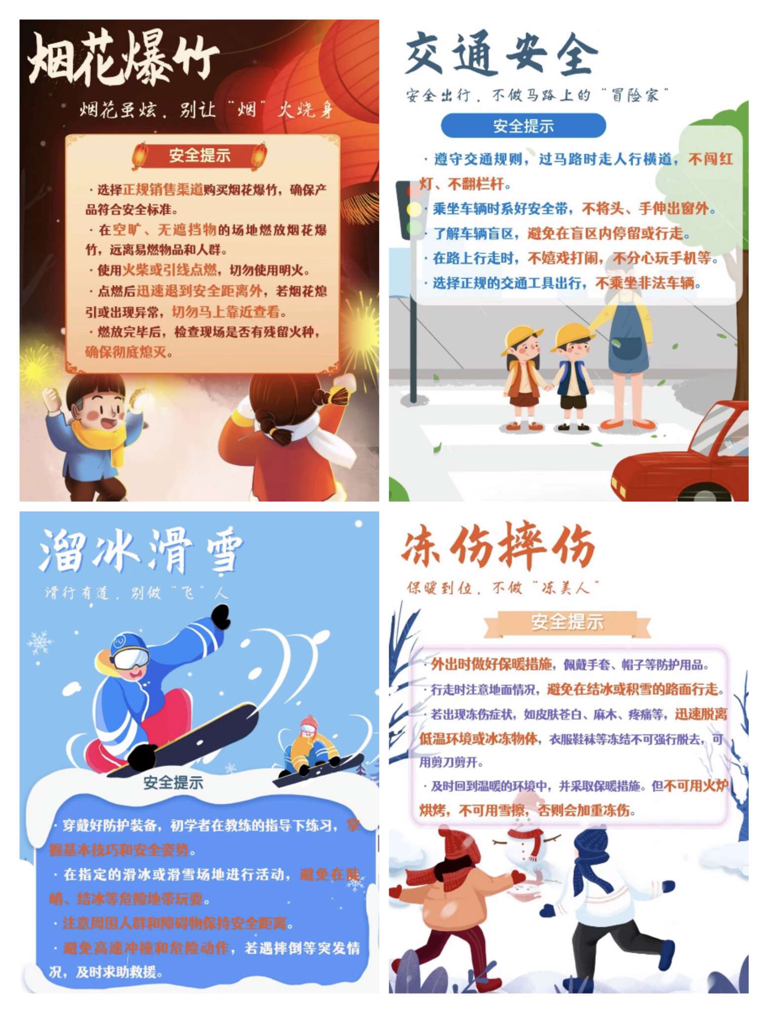 1. 防滑冰溺水:不要在河流、湖泊、水库等冰面行走、玩耍、垂钓,冰面情况不明,极易破裂。