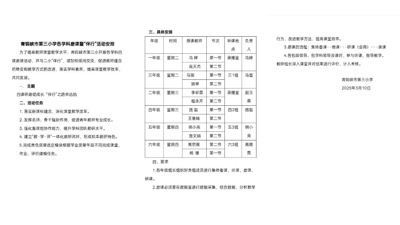 本次 “伴行”活动与“四课”赛课磨课活动结合,从语文学科开始,先由青铜峡市第三小学语文组教师在备课组展开主备到集备后在语文教研组内由主备人对修改后的单元进行整体结构化说课,大家集体诊断并修改通过后,由本年级的两位教师选取一课完整的内容(一人一课时,衔接完整)进行授课。