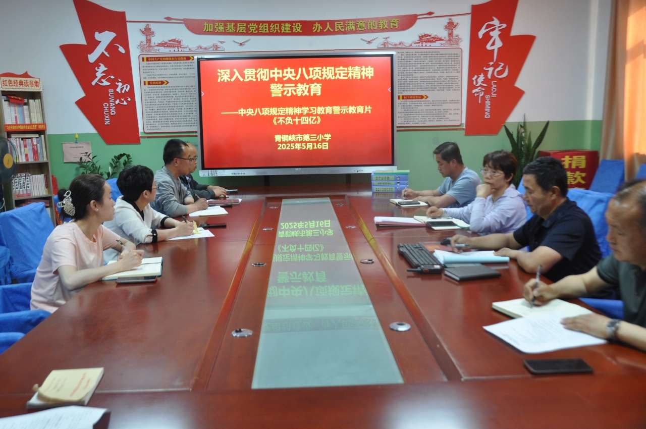 2025年5月15日,青铜峡市第三小学召开会议,进行深入贯彻中央八项规定精神警示教育。并对照《违反中央八项规定及其实施细则精神问题清单》和《隐形变异的作风问题清单》开展问题再查摆及再整改。