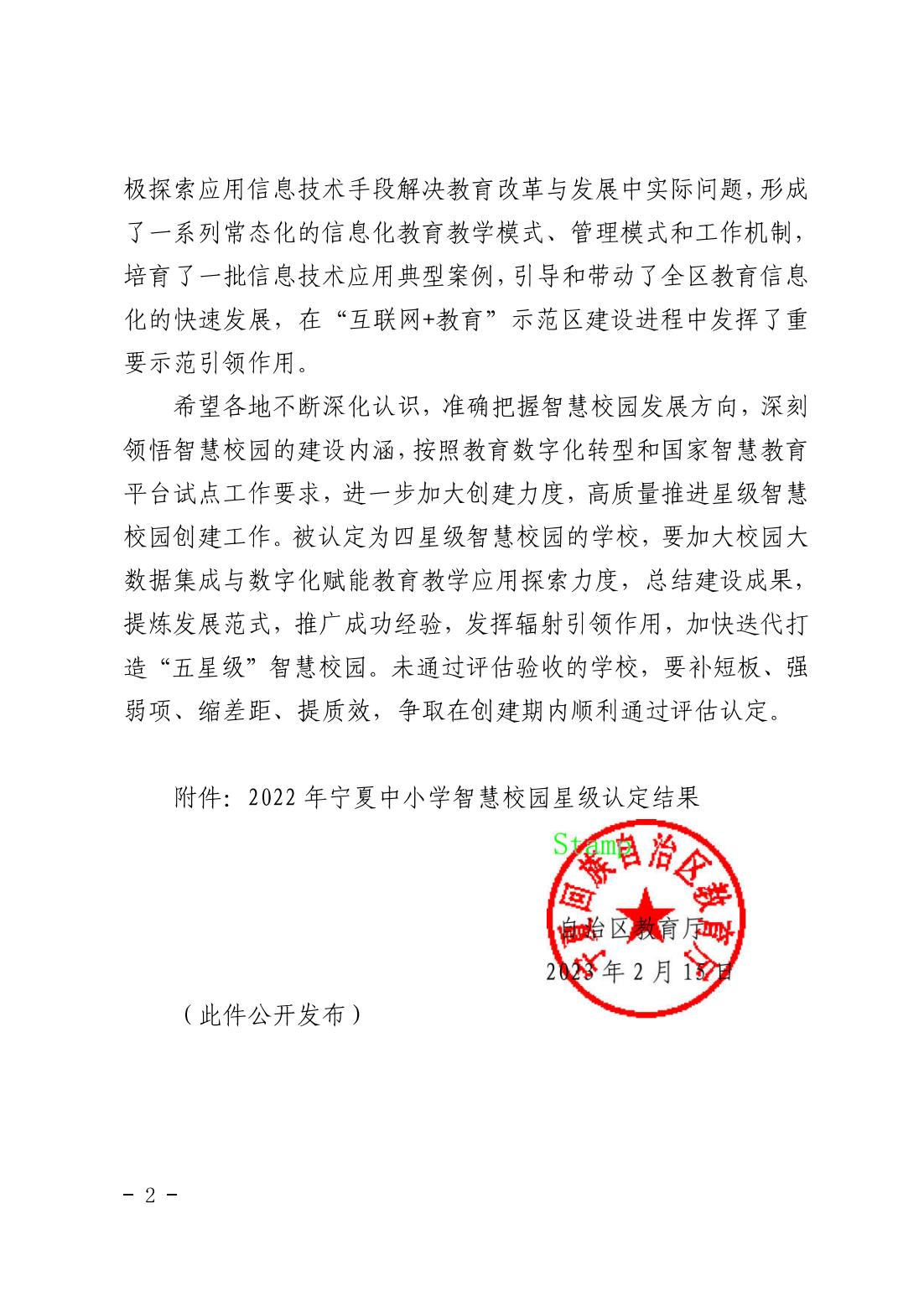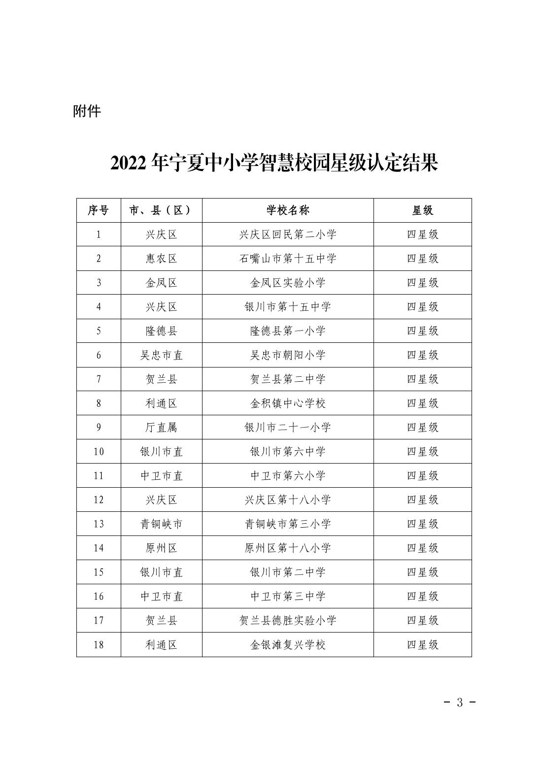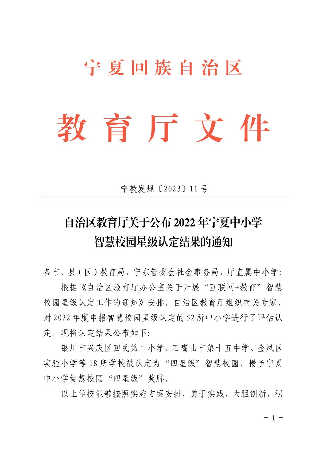 自治区教育厅关于公布2022年宁夏中小学智慧校园星级认定结果的通知