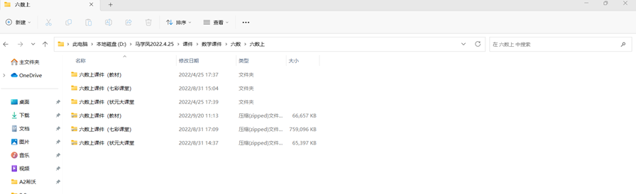 3、在六上课件资源里建了3个文件夹:六数上(教材)、六数上(状元)、六数上(七彩)
