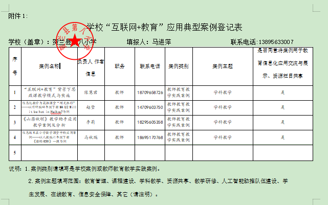 序 号 | 案例名称 | 负责人 作者信息 | 职务 | 联系电话 | 案例类别 | 案例主题 | 是否同意将案例用于教 育信息化应用交流与展 示、资源栏目共享 |