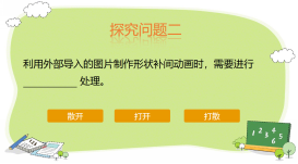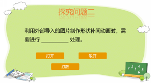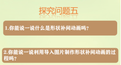 引导探索,建构新知 引导探索,建构新知 引导探索,建构新知 | 探究活动一:陶土变陶瓷 师:为了更好的学习制作这个动画,我们一起来玩一个闯关游戏,游戏共有3个关卡,每通过1个关卡,可自动解锁一款陶瓷宝贝。  第一关:图形的导入 要求:打开Flash软件,导入“陶土”和“陶瓷”的图片,调整图片的大小和位置,并完成探究问题一。 友情提示:  学生自主操作,教师巡视指导。 小老师演示操作步骤,教师根据情况补充任意变形工具的使用。  问题交流。 第二关:图形的打散 要求:下面请同学们将“陶土”和“陶瓷”的图片进行“打散”操作。 播放微课。 学生自主操作,教师巡视指导。 问题交流         第三关:设置形状补间动画 要求:下面请同学们选中第1帧,将下方“帧”属性面板中的补间设置为“形状”。 友情提示:  学生自主操作,教师巡视指导。 问题交流。  | 听任务,明要求。 选择学习方式,明确制作步骤。 自主探究 积极思考,回答问题。 听任务,明要求。 认真观看微课,明确制作步骤。 自主探究 听任务,明要求。 选择学习方式,明确制作步骤。 自主探究 | 通过探究活动一的第一关,让学生学会如何导入图片,掌握任意变形工具的使用方法。 通过学生演示,明确导入图片的步骤,理解任意变形工具的使用方法。 通过探究活动一的第二关,让学生明白打散的意义以及如何进行打散。 通过探究活动一,学生自主操作之后,总结形状补间动画的的制作过程以及明白什么是形状补间动画。 |