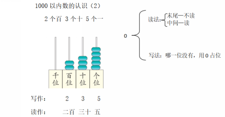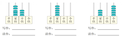 小结:写数时从最高位写起,哪一位上有几颗珠子,就在那一位上写几。哪一位上一个珠子也没有,就在那一位上写0占位。 读数时从最高位读起,百位上是几就读作几百,十位上是几就读作几十,个位上是几就读几,中间的0读作零,末尾的0都不读。 3、走进生活、解决问题 1.先说出下列计数器上的珠子表示什么,再读写出这些数。 写作: 写作: 写作: