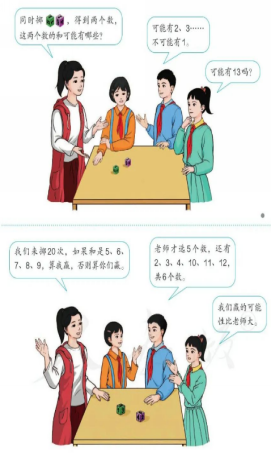 教学难点 | 探索两个骰子点数之和在5,6,7,8,9居多的道理。 |