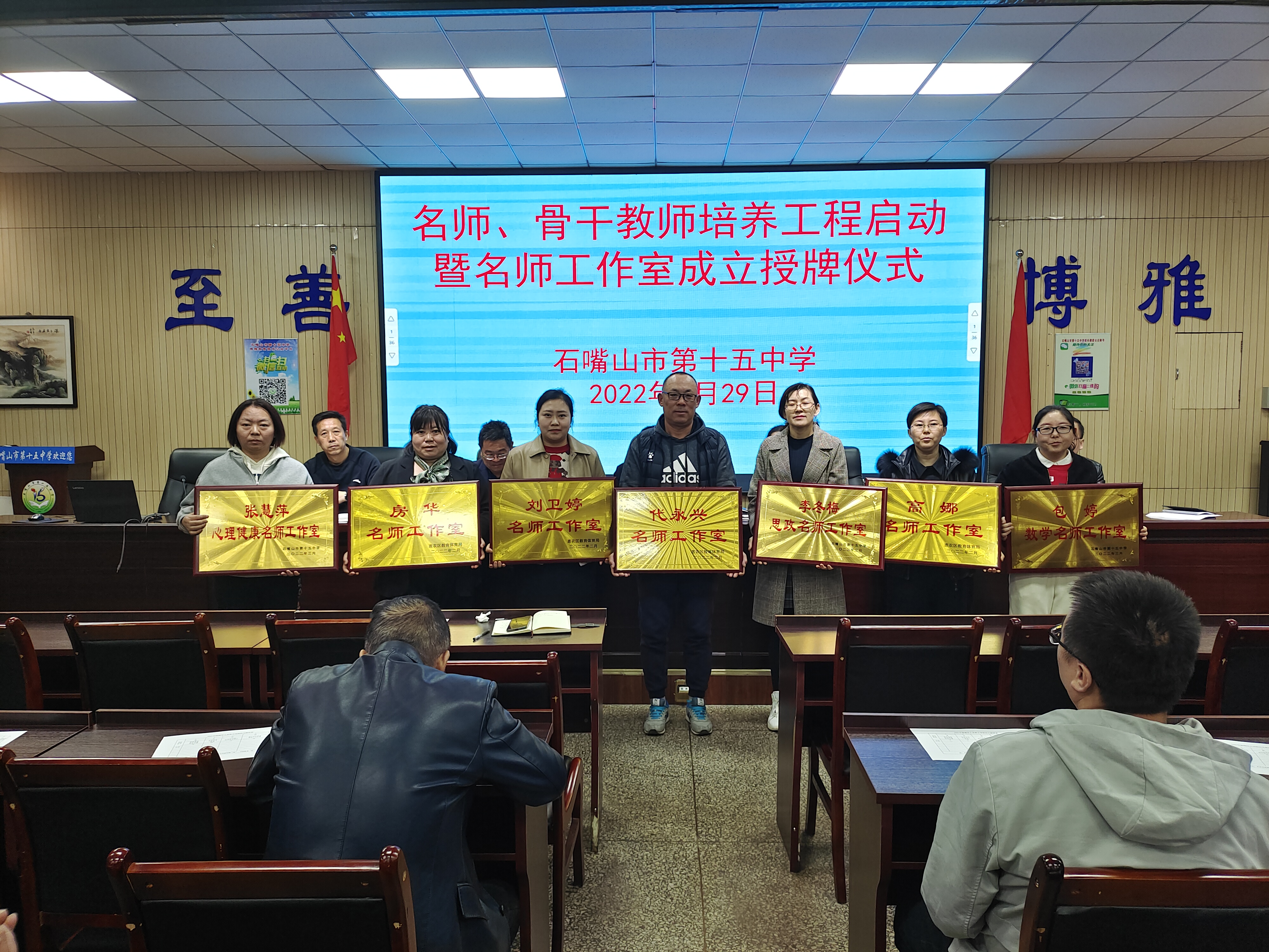为加快落实基础教育质量提升行动, 促进教师专业发展。石嘴山市第十五中学牢固树立“人才是第一资源”的治校理念,大力实施名师、骨干教师培养工程,以三年为周期培养一批在惠农区有影响力的名师和骨干教师,为学校持续发展奠定人才基础。2022年3月29日上午石嘴山市第十五中学举办了名师、骨干教师培养工程启动暨名师工作室授牌仪式。学校为7个名师工作室授牌,其中4个惠农区级名师工作室,3个校级名师工作室。分别是代永兴体育名师工作室、刘卫婷英语名师工作室、房华音乐名师工作室、高娜语文名师工作室、李冬梅道德与法治名师工作室、张慧萍心理健康名师工作室、包婷数学名师工作室。