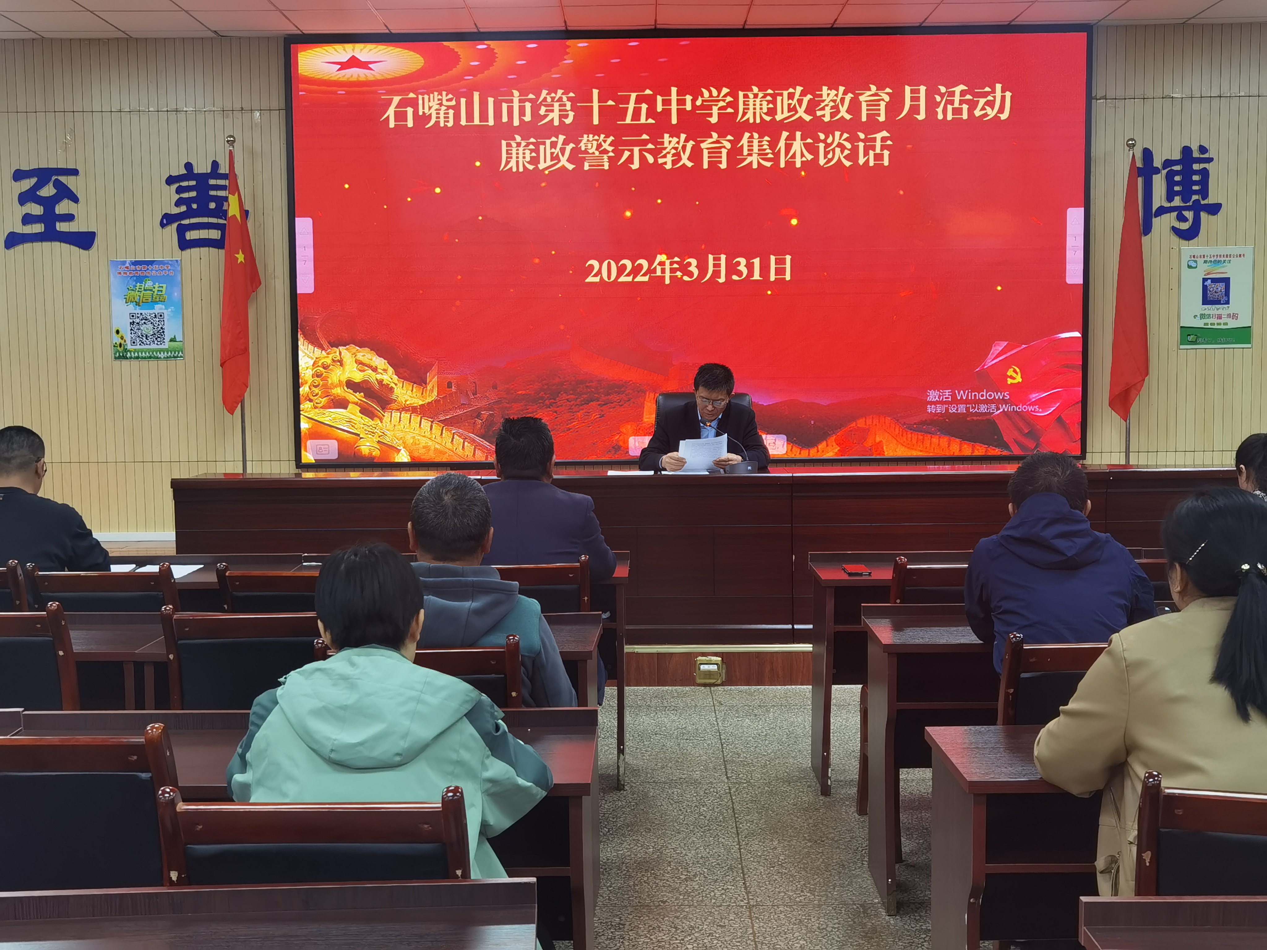 2022年3月31日,石嘴山市第十五中学党支部书记与全体校领导、主任、年级组长进行了廉政警示集体谈话。