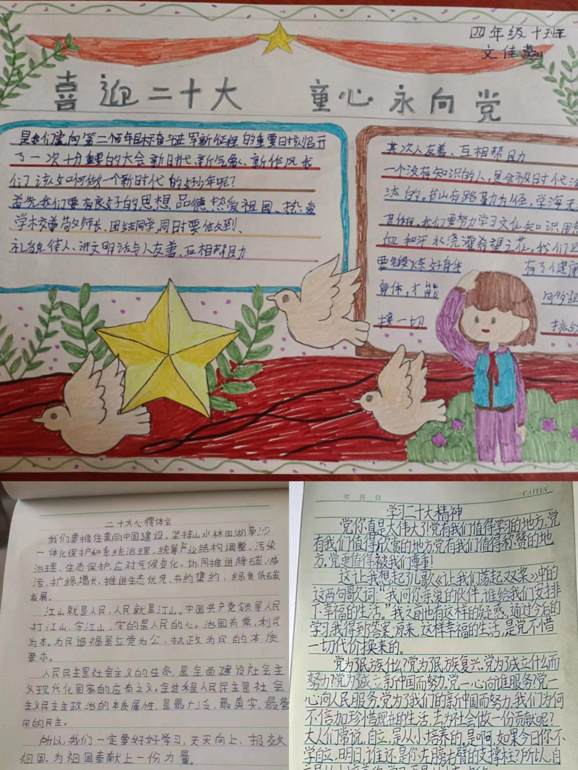 党的二十大是在进入全面建设社会主义现代化国家新征程的关键时刻召开的一次十分重要的大会,对全面建设社会主义现代化国家、全面推进中华民族伟大复兴具有重大意义。10 月 31 日下午,学校利用班会课,让班主任带领同学们一起学习了党的二十大精神,并且交流发言,谈感受,同学们积极交流,纷纷表示将坚定理想信念,争做有理想、有本领、有担当、有使命的新时代好少年。通过这次班会学习交流,同学们还将学习党的二十大精神通过绘画和手抄报的 形式展现出来,以此来表达爱国主义情怀。