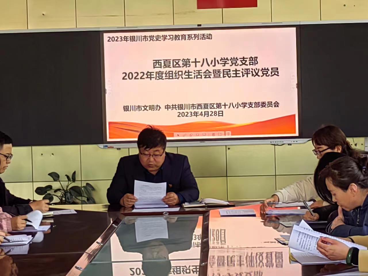 为深入学习贯彻习近平新时代中国特色社会主义思想和党的二十大精神,增强“四个意识”、坚定“四个自信”做到“两个维护”,弘扬伟大建党精神,更好地发挥党组织的战斗堡垒作用和党员的先锋模范作用。西夏区第十八小学党支部于2023年4月 28日召开了组织生活会,开展了民主评议党员工作。
