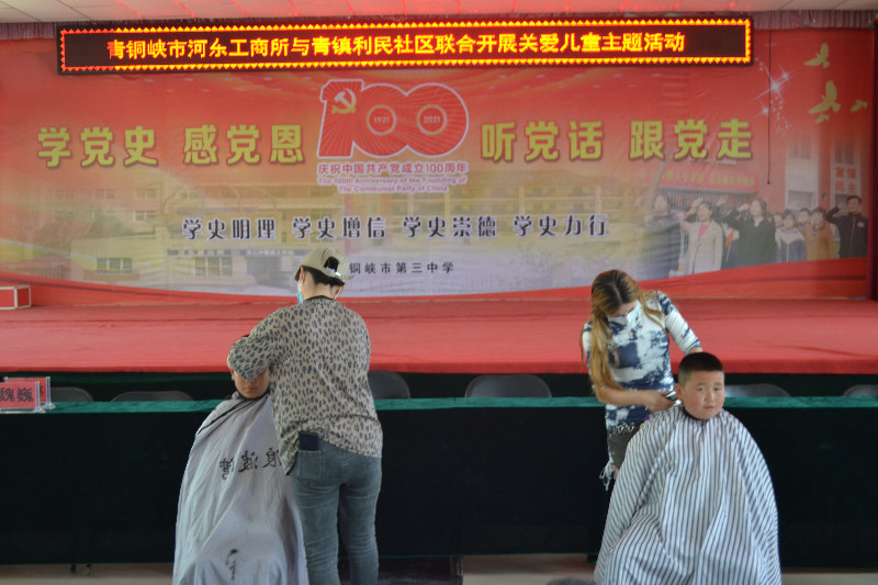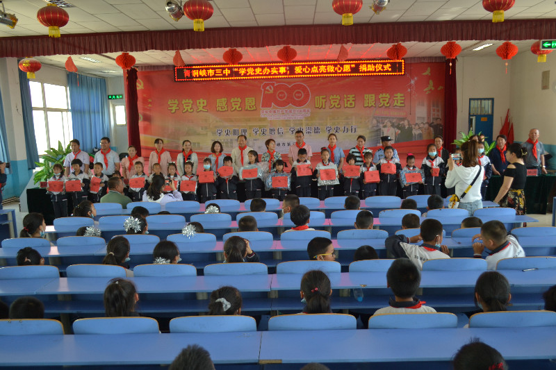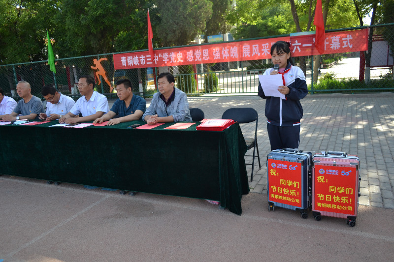 内容为:1. 开幕式【1)全体起立,高唱国歌;2)姚国书记致贺词;3)优秀辅导员代表罗建红老师发言;4)优秀学生代表王欣悦发言;5)宣读表彰决定;6)颁奖;7)全体师生共唱《没有共产党就没有新中国》】;2. 一至八年级开展“绳彩飞扬、旋风乒乓”比赛活动;3. 捐助活动[1)民盟青铜峡市委员会捐助图书;2)工商联会员企业宁夏京成天宝饲料添加剂有限公司捐资助学;3)市三中“学党史办实事,爱心点亮微心愿”捐助活动;4)青铜峡市河东工商所与青铜峡镇利民社区联合开展关爱儿童主题活动];4. 走访慰问残疾学生。