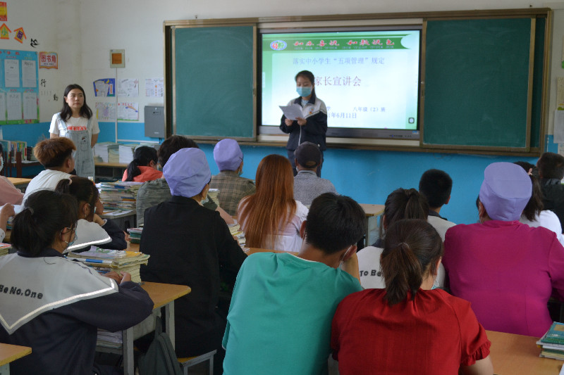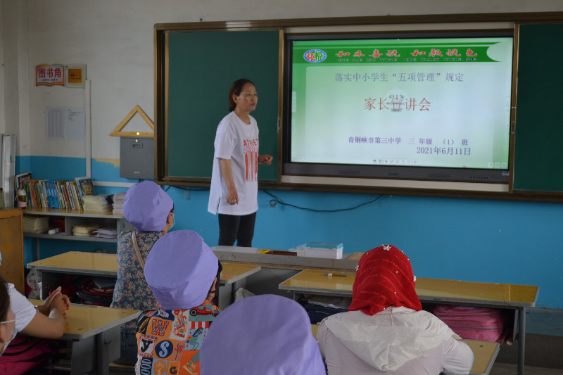 为了认真落实中央有关文件要求和2021年全国教育工作会议精神及自治区教育厅、市教育局相关通知要求,进一步做好中小学生“五项管理”(作业、睡眠、手机、读物、体质)工作,加强安全教育和预防传染病知识教育,引导家长形成正确的家庭教育观,形成家校协同育人合力,促进学生健康快乐成长。青铜峡市三中于2021年6月11日认真组织开展了落实“五项管理”规定家长宣讲会。