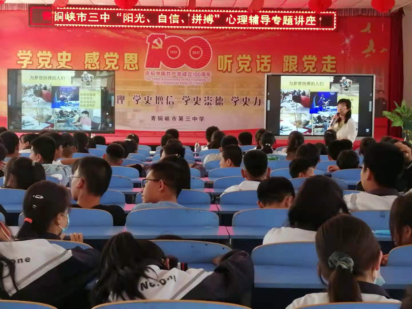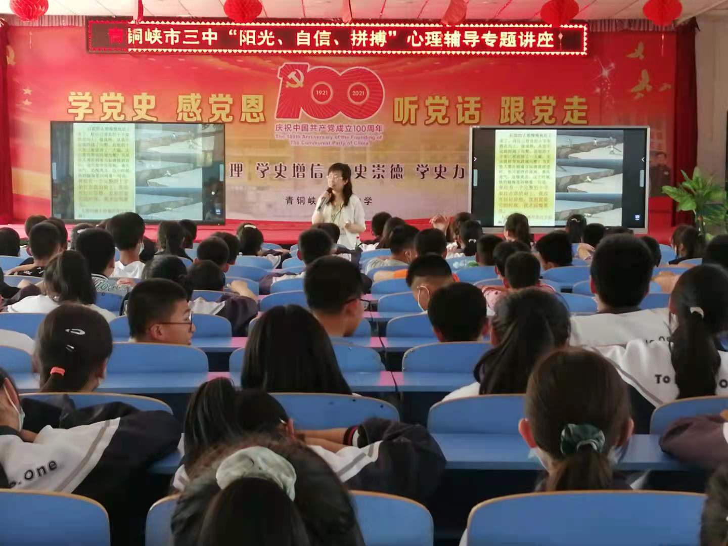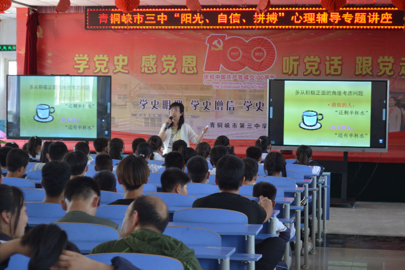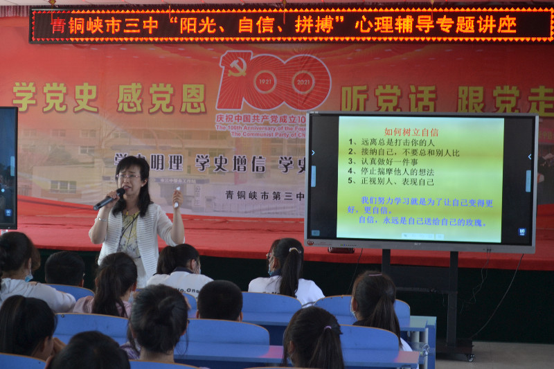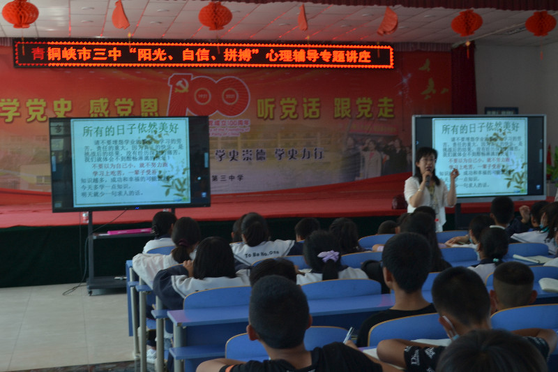 为了加强初中部学生的心理健康辅导,帮助学生解决学业上紧张繁重的问题,疏导缓解学生面临期末考试带来的巨大压力,克服青春期带来的困惑,牢固树立正确的人生观和价值观,增强学生“阳光、自信、拼搏”的意识,引导学生正确认识成长中的烦恼,勇敢面对考试,理性认真的学习生活,做一个对社会、国家有用的人。青铜峡市三中于2021年6月23日认真组织开展了《阳光、自信、拼搏》心理辅导专题讲座活动。