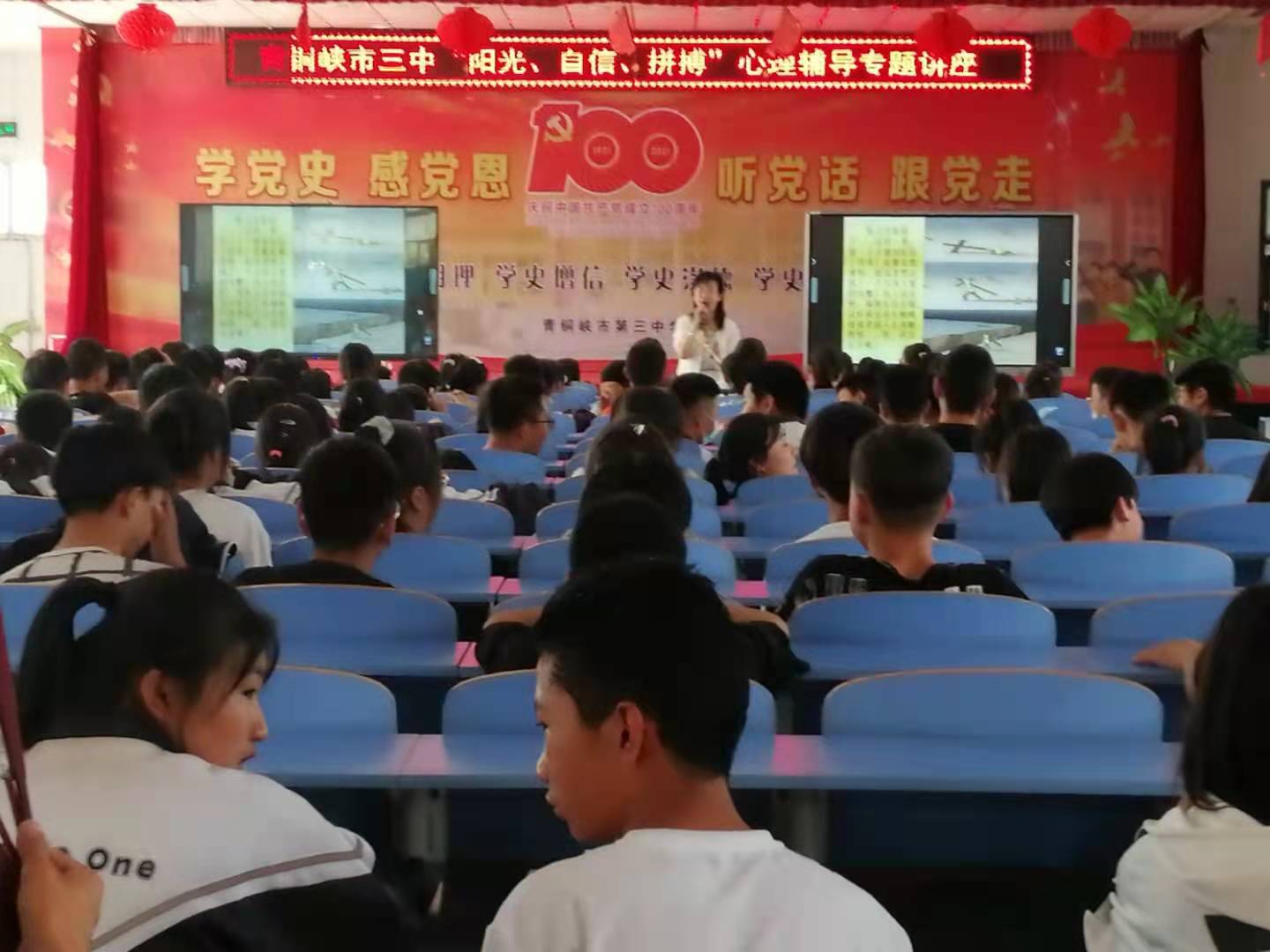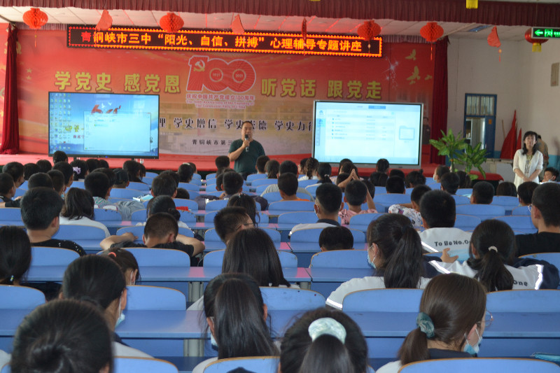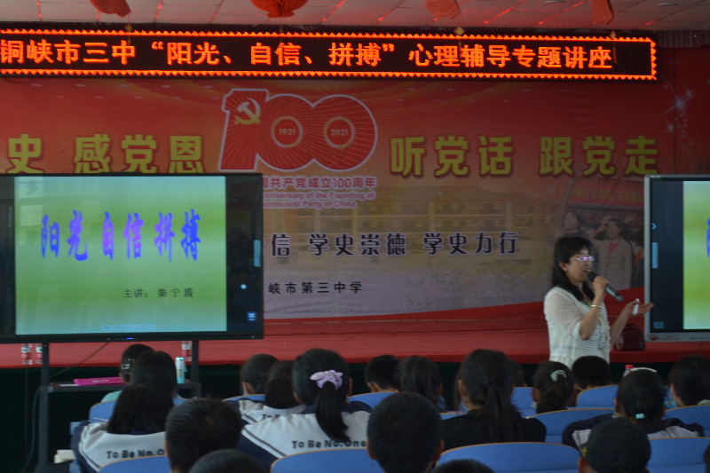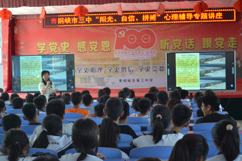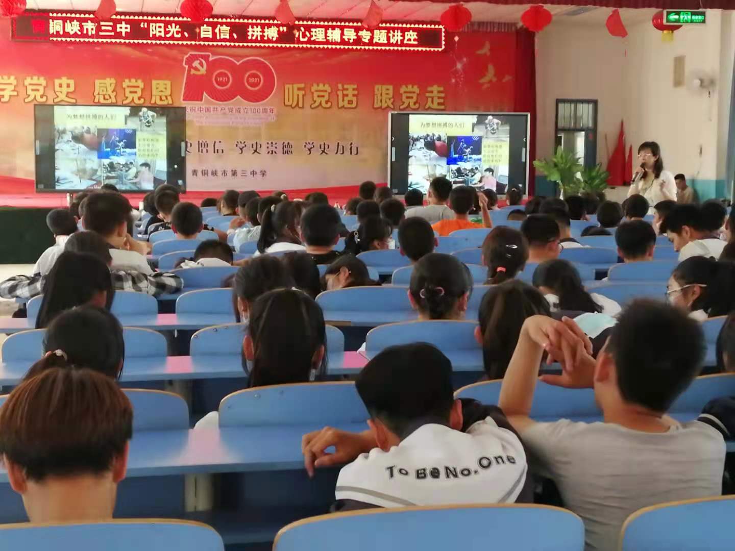 为了加强初中部学生的心理健康辅导,帮助学生解决学业上紧张繁重的问题,疏导缓解学生面临期末考试带来的巨大压力,克服青春期带来的困惑,牢固树立正确的人生观和价值观,增强学生“阳光、自信、拼搏”的意识,引导学生正确认识成长中的烦恼,勇敢面对考试,理性认真的学习生活,做一个对社会、国家有用的人。青铜峡市三中于2021年6月23日认真组织开展了《阳光、自信、拼搏》心理辅导专题讲座活动。