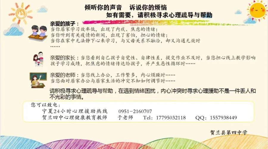 贺兰四中心理健康教师联系方式及心理疏导时间安排。