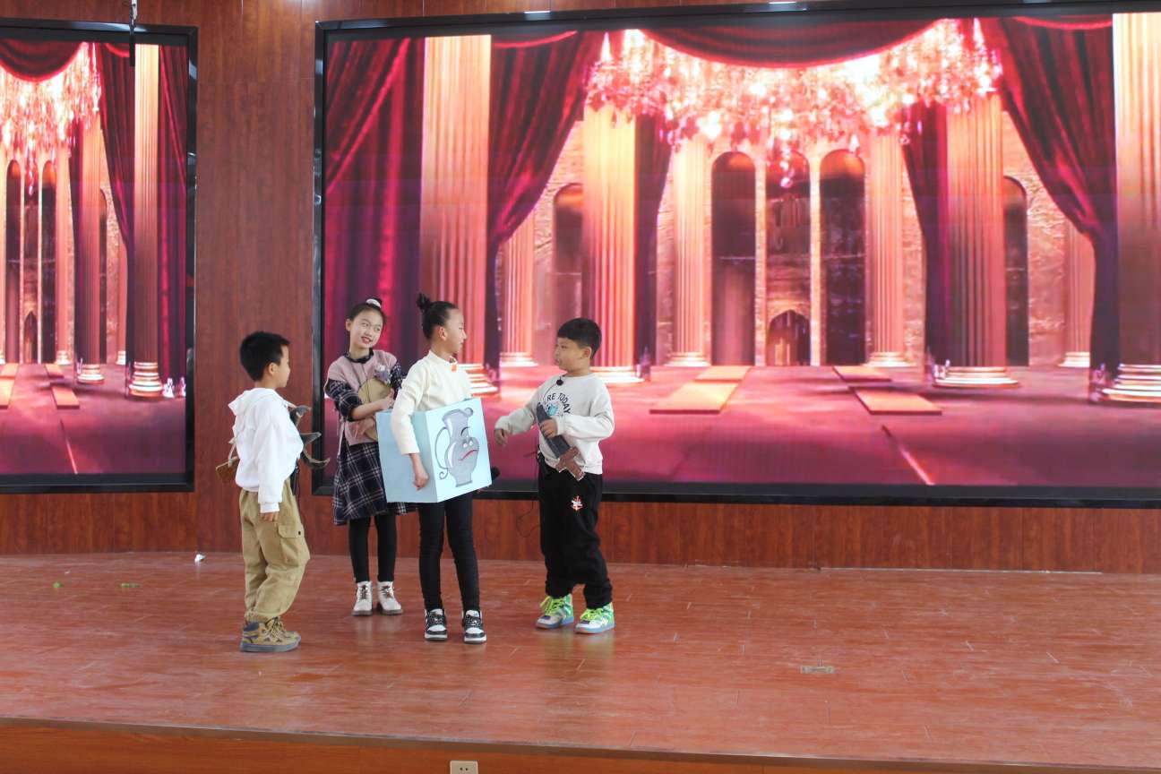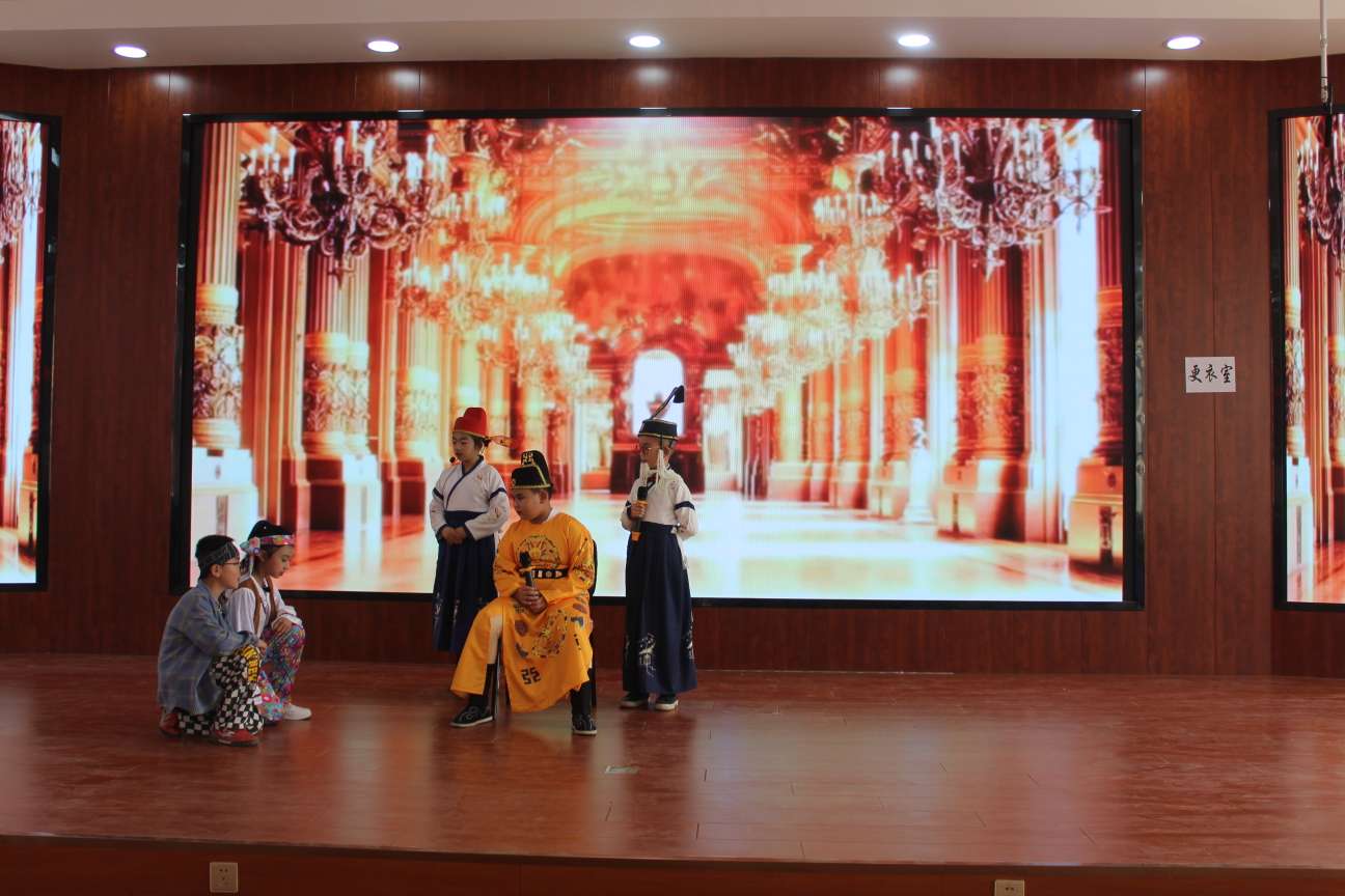 一个个小演员走上舞台,走进课本、走入故事,以剧中角色演绎了一个又一个经典剧目:一班《守株待兔》、二班《鹿角和鹿腿》、三班《大青树下的小学》、四班《皇帝的新装》、五班《陶罐和铁罐》同学们把一个个童话故事活灵活现地展现在我们面前,深入浅出地揭示了一个个耐人寻味的道理。