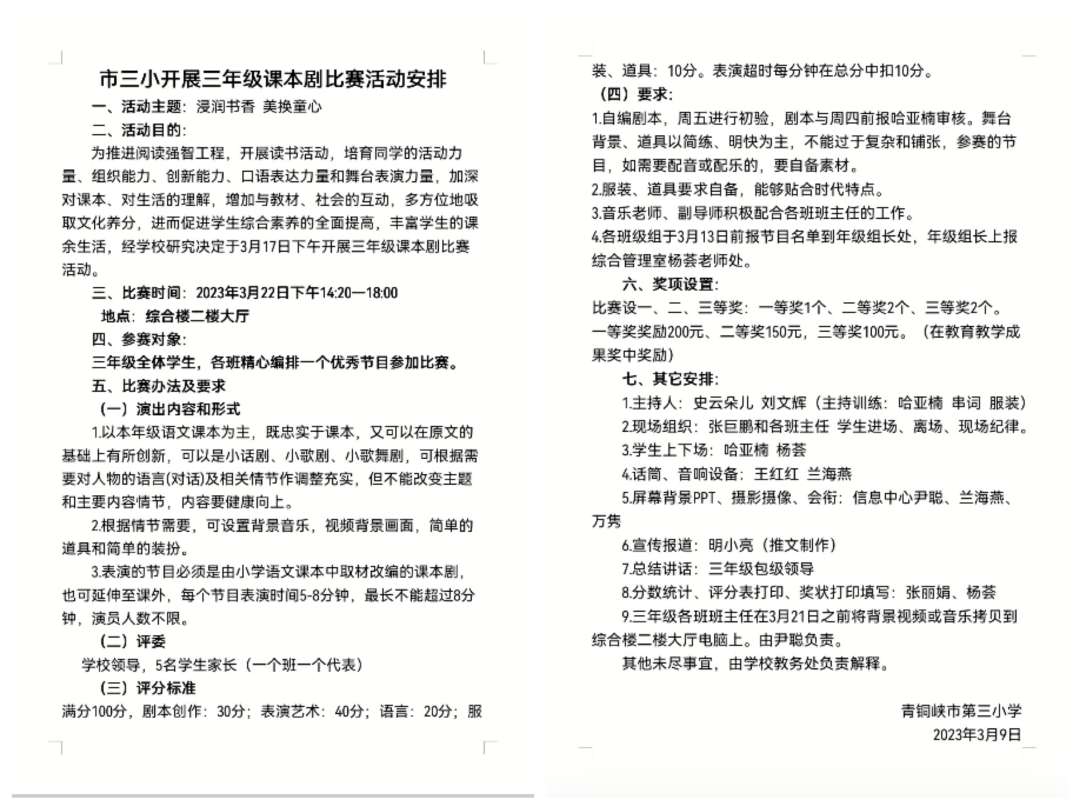 比赛前,青铜峡市第三小学制定了详细的活动方案,发动同学们主动参与。各班也积极组织,同学们自编自导自演,认真排练,精心准备。