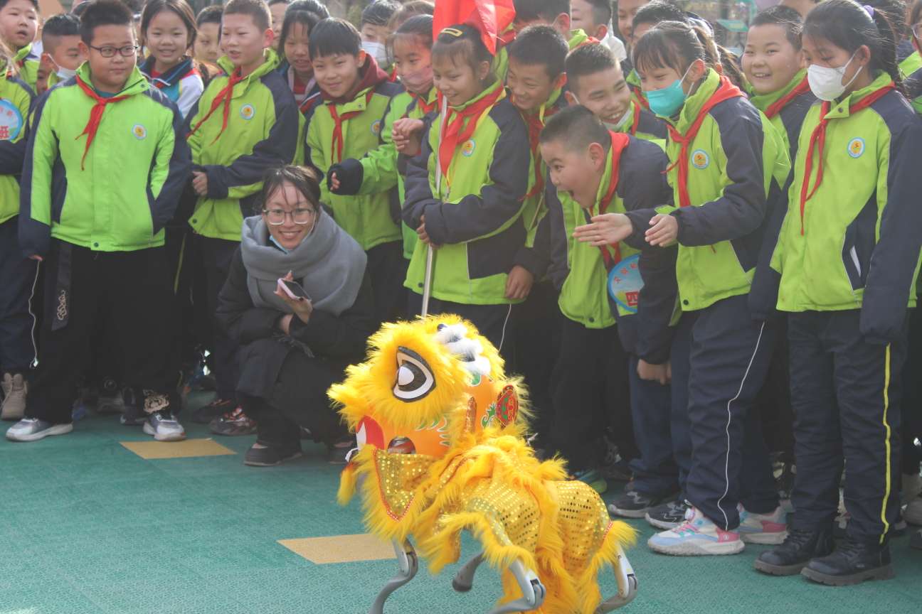 典礼现场,两台智能机器狗组成的"科技方阵"惊艳亮相。这些融合AI技术的四足机器人不仅展示了灵动的舞姿,更与师生展开趣味互动:在编程指令下完成俯首、拱背任务,引得孩子们欢呼雀跃。六年级(1)班哈思涵同学兴奋地说:"它们能识别我的指令,太神奇了!我将来要设计更厉害的机器人!