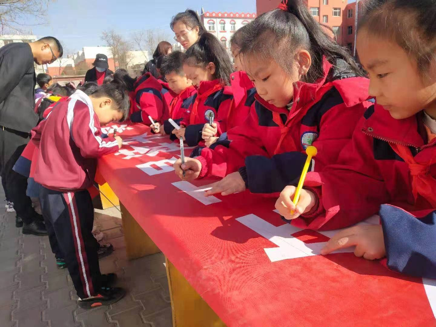 少年正是读书时,莫负青春好时光,在这“阳春布德泽,万物生光辉”的三月,让我们一起唱响春天、诵读春天。学校以年级组为单位组织开展吟诵“春天”主题的古诗词。同时还进行了“少年正是读书时,莫负青春好时光”,全体学生签字仪式。接着在大队辅导员的带领下全体同学们举起右拳一起呼号:少年正是读书时,莫负青春好时光。