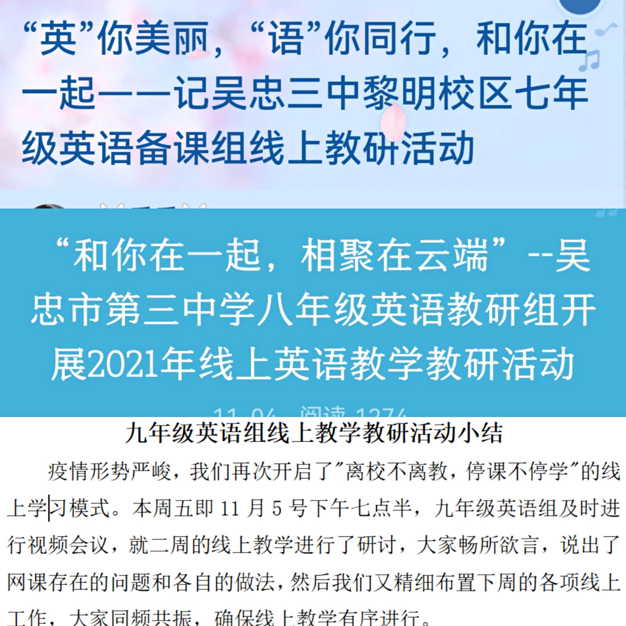 古人云:一花独放不是春,百花齐放春满园。一场突如其来的“疫情”打乱了学校正常的教学教研方式。我校全面贯彻教育局文件精神,及时安排部署,于11月5日,全体任课教师积极参与各年级部教研组组织的“和你在一起”线上教研系列活动。通过研讨解决了近期线上教学出现的实际问题,也将有特色、有亮点、有实效的教学经验进行了分享,为今后的线上教学工作的顺利高效开展提供了有力保障。
