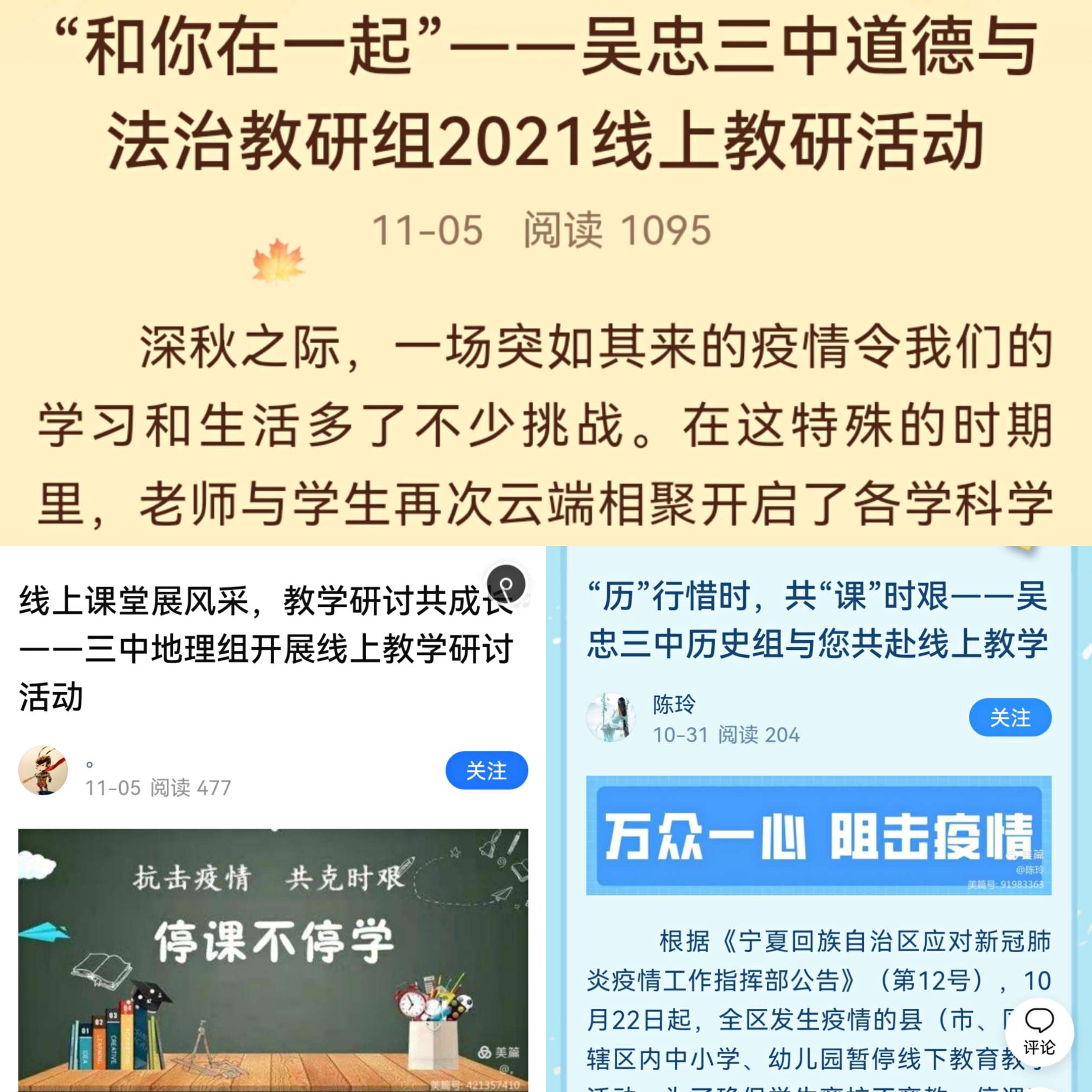 通过此次“和你在一起”线上教研活动,全体教师对线上教学课堂组织与互动、重难点问题辅导与答疑、学生线上学习的有效监督等方面进行了分析总结和经验分享。教师代表、各年级部毫无保留地分享了线上教学的宝贵经验,研讨线上教学过程中遇到的问题和困难,集思广益,找出了切实的解决办法。疫情无情人有情。凛冬虽然已至,但相信,只要我们三中人抱团取暖,始终牢记人民教师的使命,用爱完成线上教学任务,共“课”时艰,疫情终时就是我们校园重聚之时!