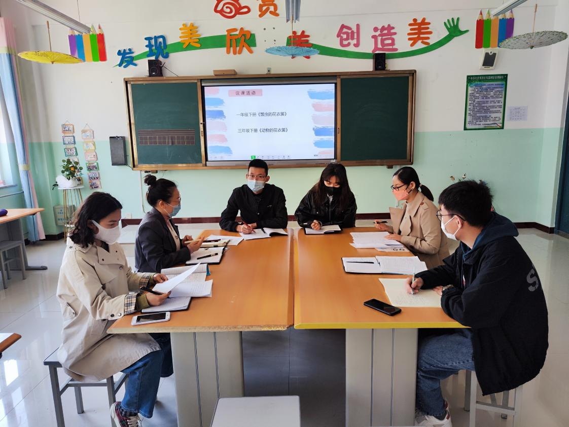 第一项:议课活动。围绕两位做课教师的课例进行自评与互评。首先,朱文卓老师分享了人教版一年级下册《瓢虫的花衣裳》一课设计流程、设计亮点、以及教学后的所感所想。接下来由李刚刚老师对执教的人教版三年级下册《动物的花衣裳》一课,从课程的整体设计流程、课程中出现的问题两个方面向大家阐述了课程设计的亮点之处,并及时反思,总结改进措施。美术组教师结合课例,围绕“如何针对低学段学情备课”专题进行研讨交流,互相切磋,提炼方法与技巧。