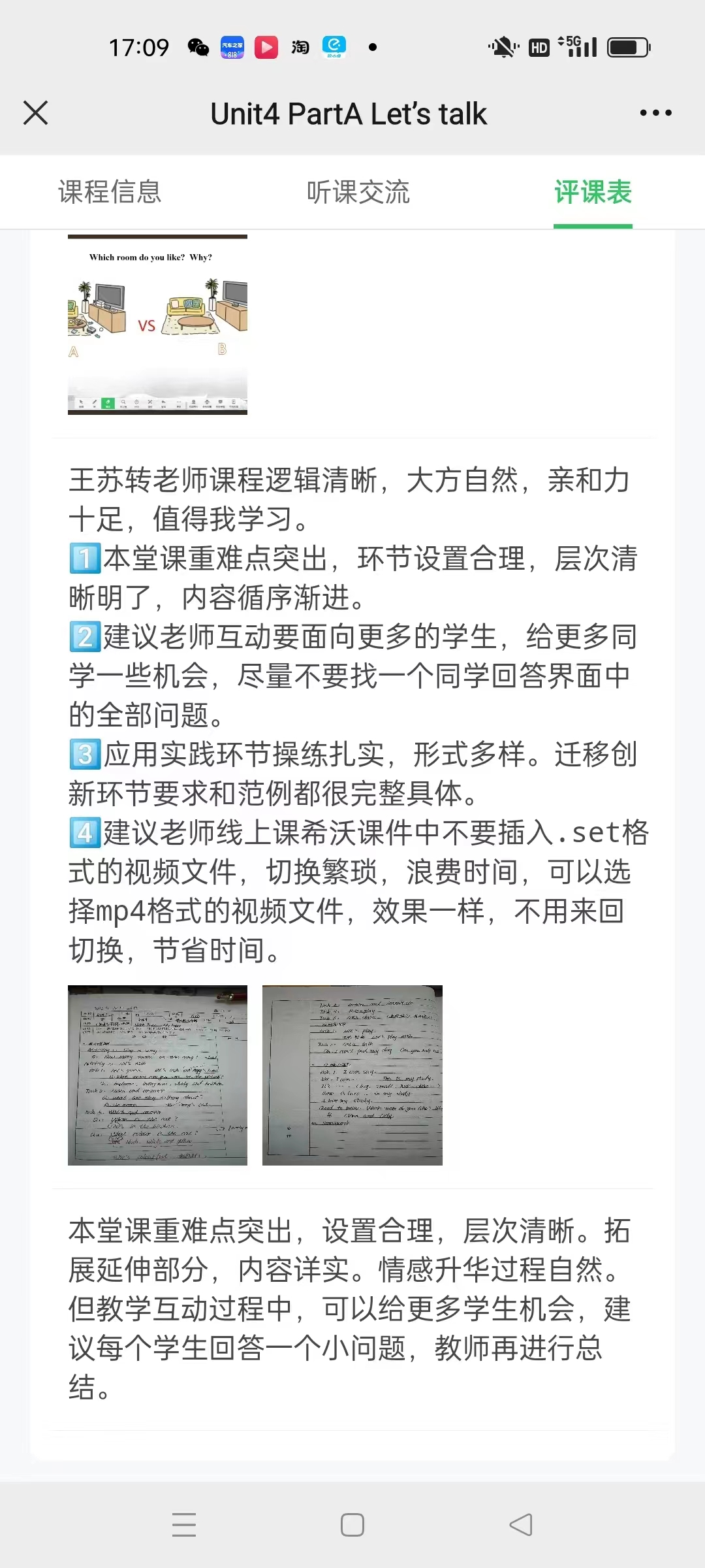 在校内教研活动中,王苏转老师精心选课,英语组同步线上研课,纷纷畅所欲言,毫无保留的提出自己的经验和心得。王老师从课件的字体到设计再到一堂好课的呈现,有料高效。王苏转老师本次对话课指教内容为四年级上册My home Part A Let's talk and let's play.王老师提前进入在线课堂、做好准备,上课过程中老师通过连麦等方式使学生们紧跟老师思路,积极回答问题。课后王老师对自己的课程作出如下反思:一、口头禅口误比较多,以后会将加强口语练习。二、综合拓展类作业中应该给学生语言支架和paper sheet,希望以后线下教学的时候能够落实到位。