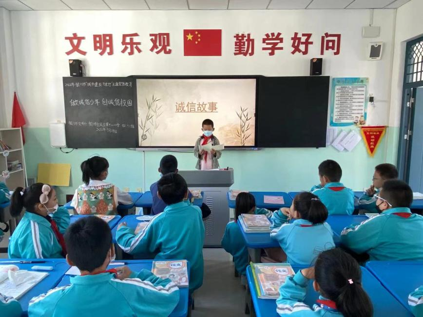 为了使诚信的阳光洒满校园,9月28日我校各年级各班举办了以“做诚信少年,创诚信校园”的主题班会,对学生们进行“诚实做人”的教育,目的是让学生理解什么是诚实守信,懂得诚实守信是中华民族的传统美德,从小事做起,用诚信立学,用诚信立行。