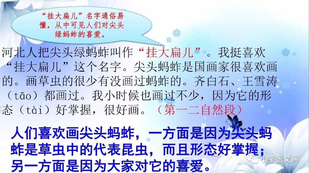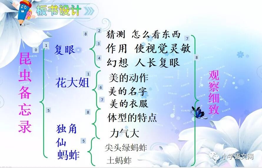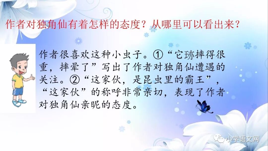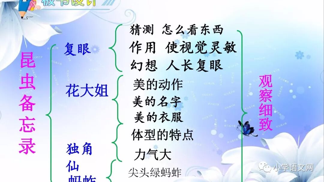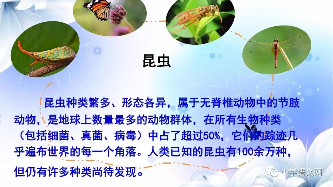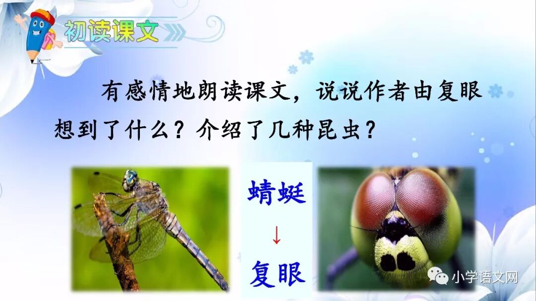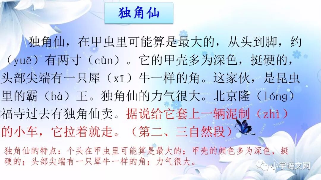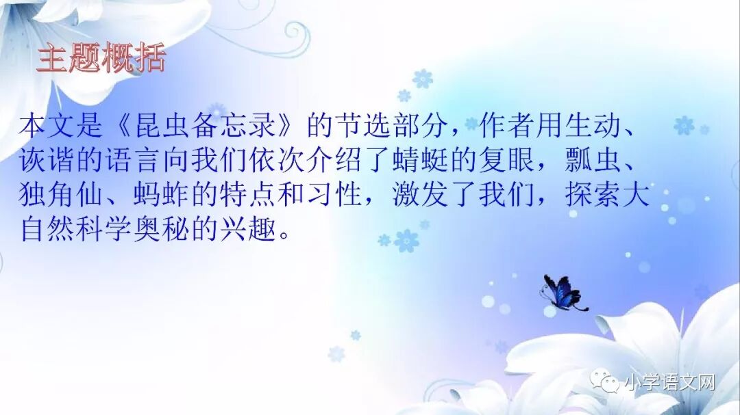 本课是部编版教材三年级语文下册第一单元的第四篇课文,包括4篇科普小短文。讲的是四种昆虫:蜻蜓、独角仙、瓢虫和蚂蚱,揭示了它们各自的小秘密。语言生动、有趣,很诙谐。描述生动,特点突出,表现了童真童趣,表达了对大自然的喜爱之情。