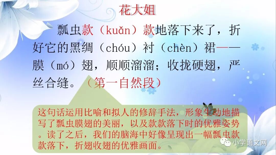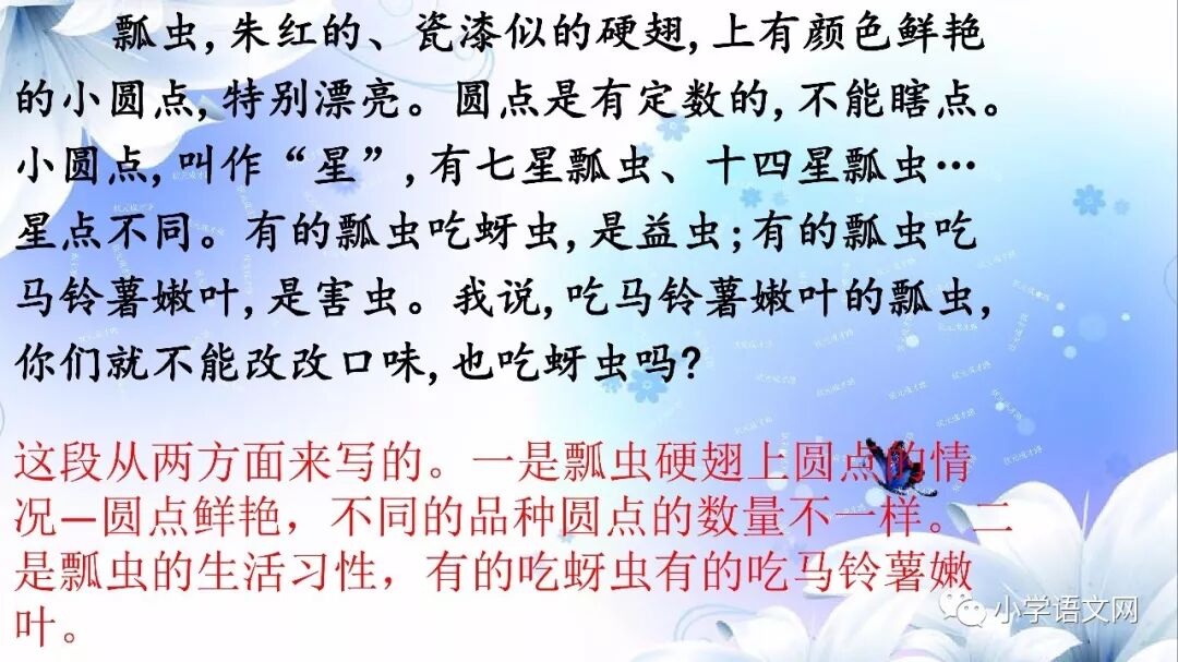 1、(瓢虫)折好它的黑绸衬裙——膜翅,顺顺溜溜。(表示解释说明。)