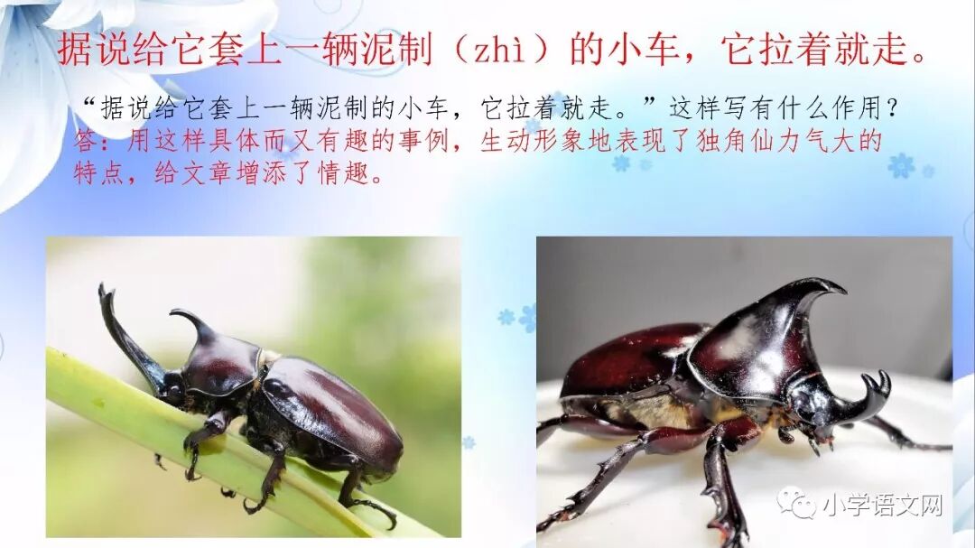 2、吃晚饭的时候,呜——扑!飞来一只独角仙,摔在灯下。(表示声音延长。)