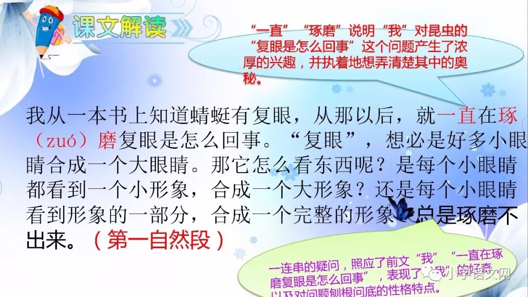 (2)在思考复眼怎么看东西这个问题时,作者用了“琢磨”一词,说明了什么?