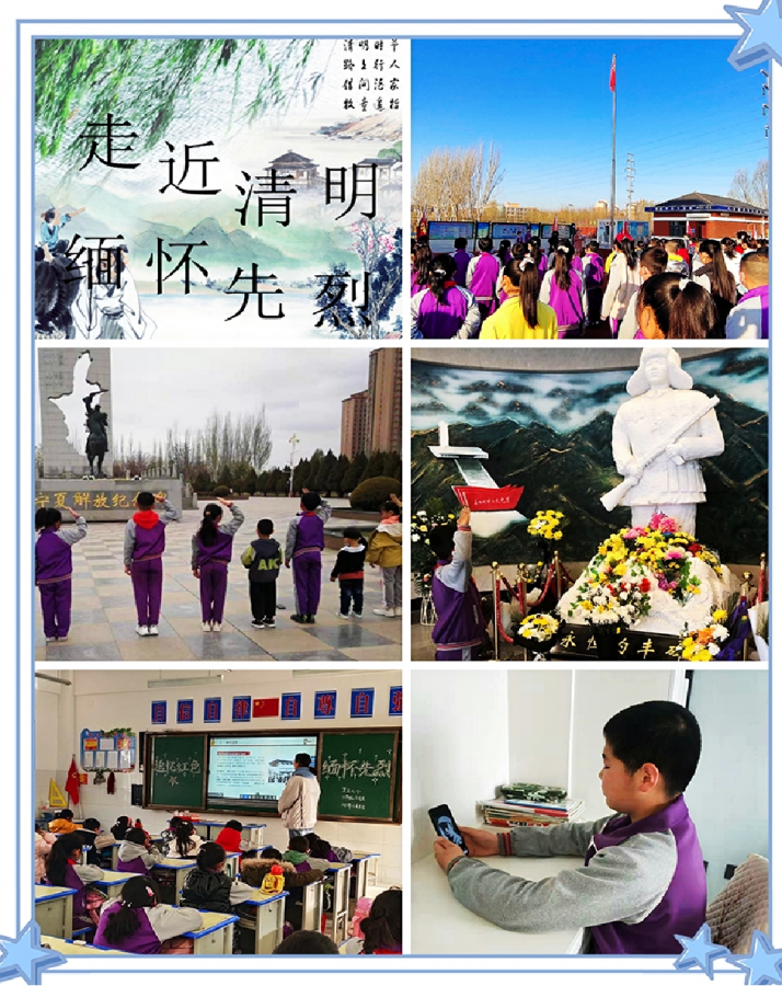 学校首先利用升旗仪式向全体师生发出了“ 缅怀先烈颂党恩 祭奠忠魂守初心”的活动倡议,倡议大家积极聆听先烈故事,学习先锋精神,歌颂党恩,祭奠忠魂,争做时代新人!接着,各中队开展了“缅怀先烈颂党恩 祭奠忠魂守初心”主题队会,通过“红领巾故事会”、清明诗文朗诵、中华经典诵读、制作手抄报、撰写征文等形式,引导队员们感悟幸福生活的来之不易!同时,我校还积极组织学生登录银川文明网,通过“清明·网上祭英烈”专栏进行签名寄语,网上追思,表达对革命先烈的缅怀和对历史的敬畏。更让人感动的是在本次主题教育的熏陶下,我校景一帆、姚佳媛、王莉臻、吴晓霜等几名学生还自发在家长朋友的带领下来到宁夏解放纪念碑前和银川市雷锋纪念馆,通过简短却真诚的默哀、敬礼、献花,来缅怀革命先烈,铭记革命英雄事迹,弘扬爱国主义精神,这何尝不是激励当代莘莘学子拼搏奋斗的好方式!英烈的精神深深震撼着学生的心灵,激发了他们的爱国热情和强烈的民族自豪感。