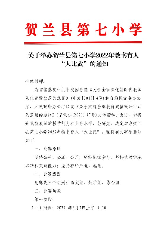 关于举办贺兰县第七小学2022年教书育人“大比武”的通知