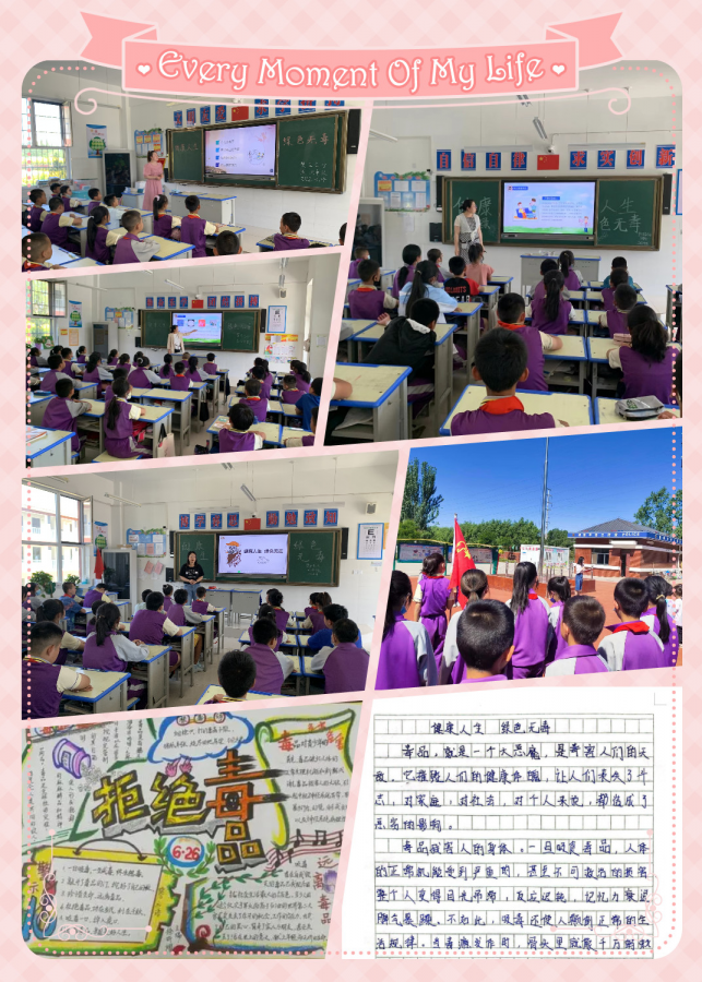 学校首先在周一升旗仪式上开展了“远离毒品,敬畏生命”主题升旗仪式,侯晨昭老师利用升旗仪式向全体师生发出倡议:珍爱生命,远离毒品,以抵制毒品为荣,倡导文明健康的生活,遵纪守法,做良好市民。随后,各班利用队日课积极召开“健康人生,绿色无毒”主题队会,各位班主任借助交互式电子白板的演示,形象生动地向同学们讲解毒品的性质、特征以及危害,并用生动的案例教育大家如何树立正确的人生观、价值观和法制观,进一步增强了同学们识毒、 拒毒、防毒的意识,取得了良好的教育效果。学校还通过微信公众号、黑板报、征文、手抄报等多种形式向学生和家长介绍毒品的危害,宣传国家有关禁毒的法律法规,让禁毒内容家喻户晓,让禁毒知识深入人心。
