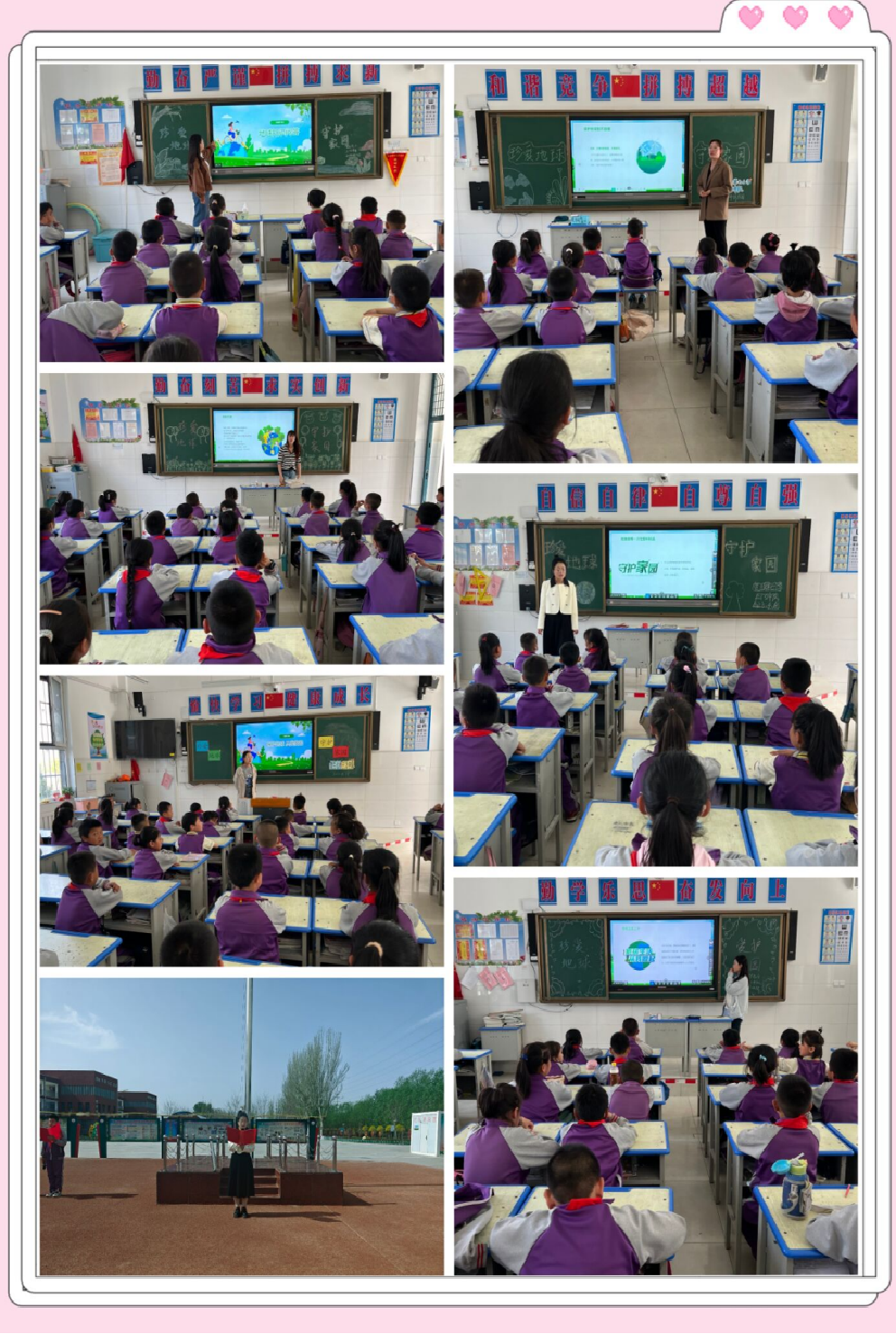 在周一升旗仪式上,三(3)中队辅导员闫佳妮以“珍爱地球 保护环境”为主题进行了国旗下讲话。呼吁全体师生关爱地球,从身边的小事做起,让我们像保护眼睛一样保护生态,像对待生命一样对待地球。随后,各中队也纷纷召开了“珍爱地球 守护家园”主题班队会。各位班主任利用图像、视频资料带领学生认识植绿护绿的重要意义,使同学们了解森林被破坏、草原退化、植被减少的恶劣后果,感悟地球母亲的无私与伟大,各位辅导员老师还倡议学生要从小遵循“环境保护、可持续和绿色发展”理念,尊重地球、善待地球,用实际行动为建设美丽地球贡献自己的力量。