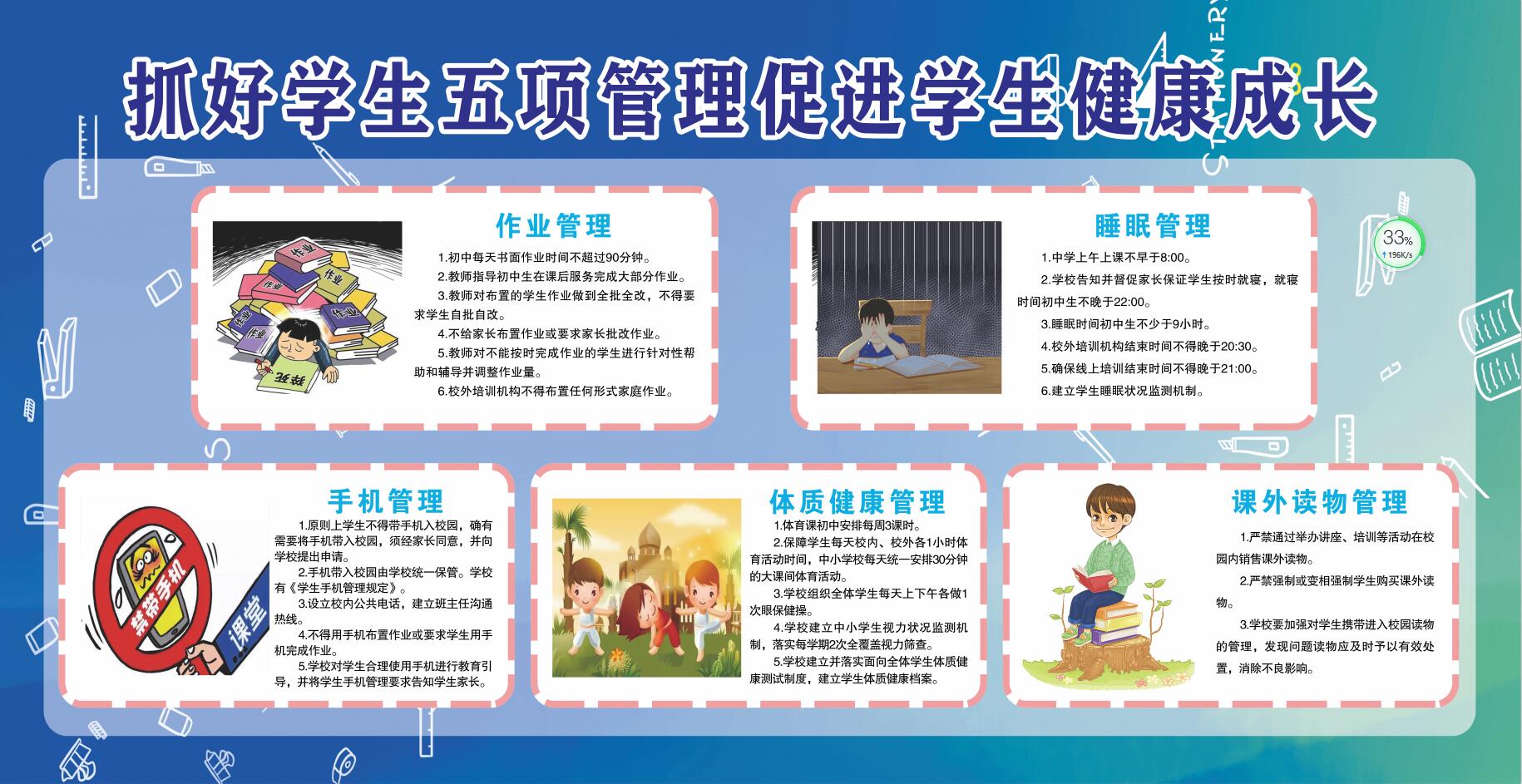 “双减”、“五项管理”、“五育并举”事关学生健康成长、全面发展,小切口、大改革、中央关心、社会关注、家长关切,以小见方向、以小见责任、以小见情怀,从不同方面体现着、贯穿着正确的育人方向。做好“双减”、“五项管理”、“五育并举”,能促进学生身心健康成长,构建良好的教育生态,提升教育教学质量。