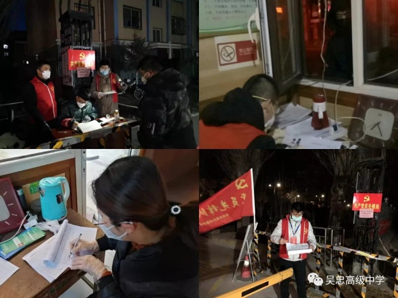 疫情就是命令,防控就是责任。每天早6:30到晚22:30,吴忠高级中学各党支部安排党员在三个小区相应的门口执勤,协助登记进入小区人员和车辆,严把小区“出入关”,对走亲访友的外来群众进行劝离,禁止一切外来车辆、人员进入小区。在登记时,工作人员和登记群众保持1.5米以上的距离,所有出入车辆、人员都需要进行登记。党员先锋队严格按照要求做到不擅自离岗、做好防护措施、佩戴党徽亮身份,立党旗等标志,加强防控和宣传。