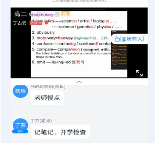 目前,我校空中课堂呈现出以下形式:1、直接做好课件通过电脑直播,画面清晰,学生感觉真实亲切;2、录好微课,让学生看完再讲题,讲完再播微课,循环进行,利于数理化理科性学科;3、下载优课视频,由一位老师给学生播放时,其他任课老师进群参与了解学生活动;4、直接拿书讲解,用一张大A3纸演示解题步骤,手机录像直播,讲题易于学生理解,但画面不够美观。5、网上收作业一个也不漏,教师在网上批阅作业能准确查知谁没有上交作业,钉钉班群由家长管控,利于学生完成作业,但质量无法保证。