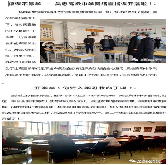 从接到教育局工作指示的第一时间,赵生祥校长就快速组织召开了总支委扩大会,安排部署相关工作。李学儒副校长主管高三,先开启网上直播工作,调动后勤人员在办公楼一楼打造录课教室,每天消毒防疫,加强门房出入管理,总务处杨静忠主任、信息中心周吉萍主任联系电信部门提升学校网速,安排信息技术教师专人为高三老师实现空中课堂教学提供技术支持,根据高三进度安排适宜有效的内容要求老师讲好课,录精课。