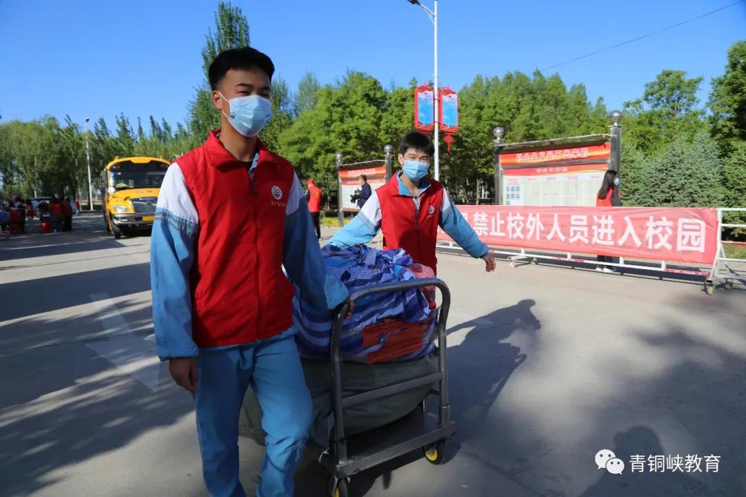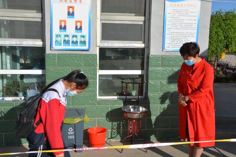 清晨,青铜峡市第七中学校长李敏在学校门口迎接返校学生,按照预定程序,家长在校门口止步,学生进入校门口接受检查,进入测温区检测体温,然后用免洗手消毒液洗手,经消毒通道,间隔排队依次进入校园,学生全程佩戴口罩,由老师们有序引导进入教室,组织上好开学防疫第一课。