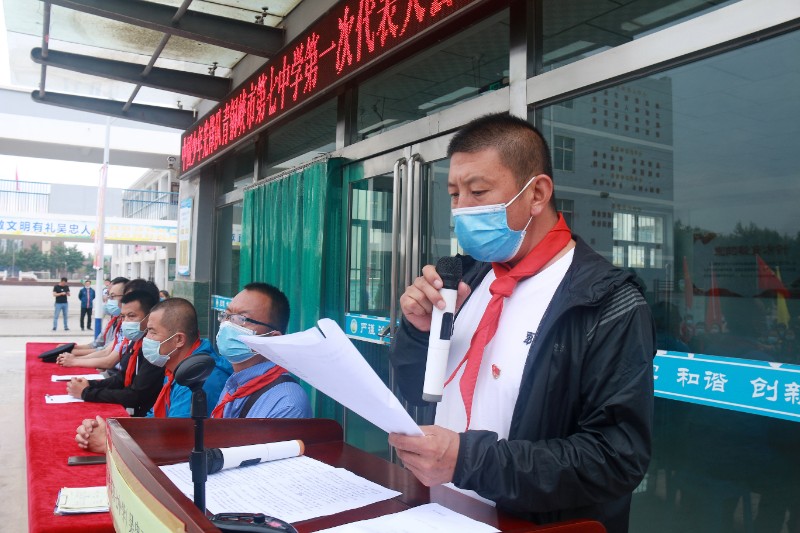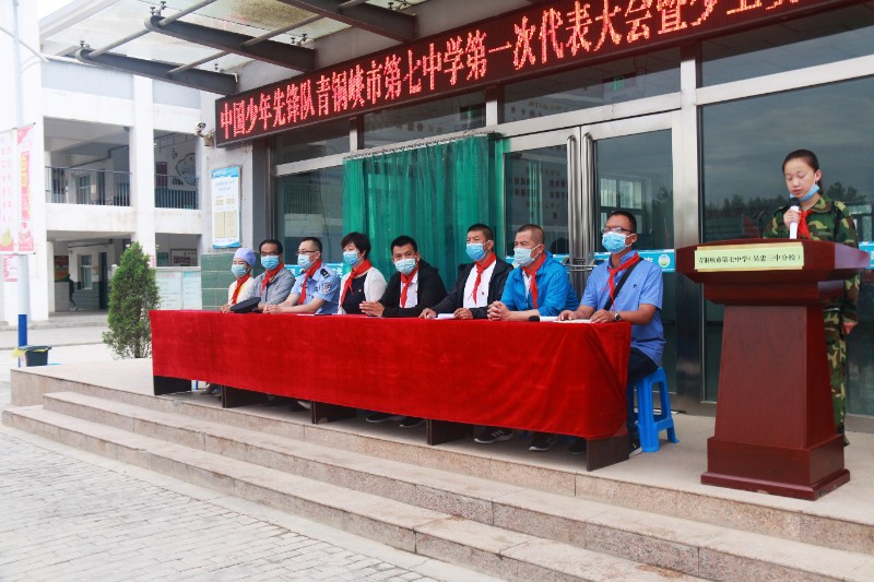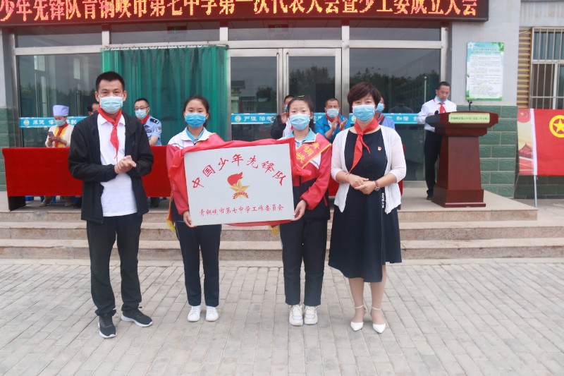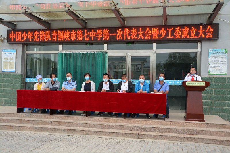 6月17日早晨,中国少年先锋队青铜峡市第七中学第一次代表大会暨少工委成立大会在市七中隆重召开了,全体七八年级师生和部分家长代表以及学校外聘法制副校长陈袁滩镇派出所所长李明同志、家委会副主任丁红艳同志参加了本次会议,在庄严的国歌声中,全体起立高唱国歌,然后在中国少年先锋队队歌响起时,少先队队旗在两名少先队员的护卫下入场,会议由七中团支部书记朱宇坤同志主持,首先由市七中副书记白少瑜同志宣读了上级少工委关于同意市七中召开少代会并成立少工委的批复,随后,市教育团工委副书记、教育局团委书记李杰、学校党支部书记、校长李敏同志为学校少工委揭牌;李杰同志代表市教育局团委向大会致贺词,校团委书记、大队辅导员朱宇坤同志向大会报告上一年工作情况,提出今后少先队工作意见,并请各代表审议工作报告,紧接着进行了市七中少工委委员的选举,全体通过后由白少瑜同志现场宣读了选举结果,李杰、李敏、白少瑜同志为少工委委员颁发了聘书,李敏同志发表讲话,对市七中少工委的成立表示祝贺,对学校少先队工作充分肯定,她希望少先队员们要刻苦学习知识,坚定理想信念,磨练坚强意志,锻炼强健体魄,为实现中华民族伟大复兴的中国梦时刻准备着。