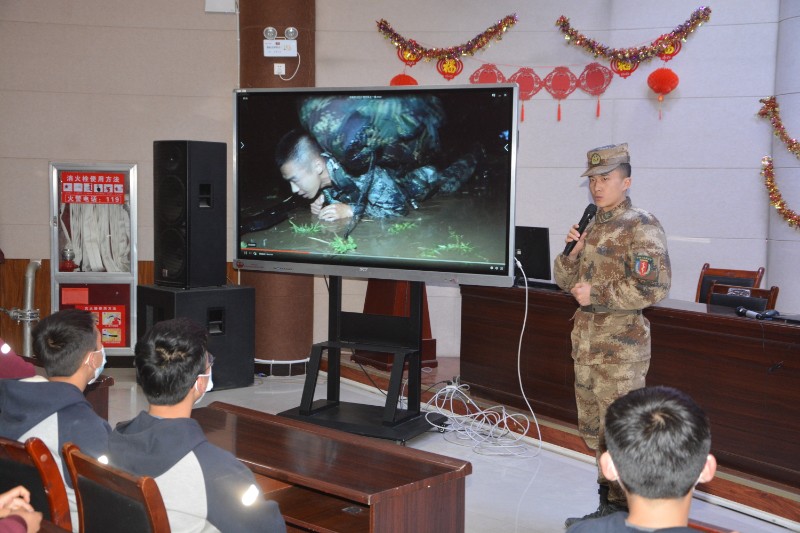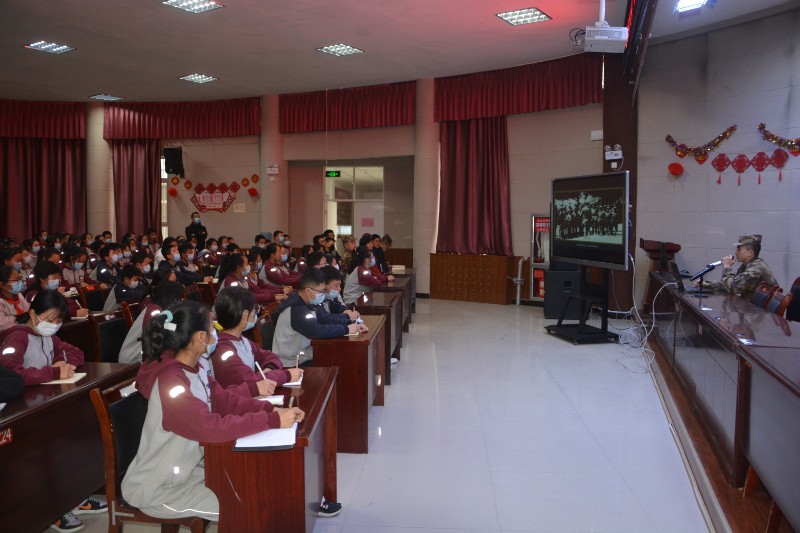 解放军某部宣讲员周瑞华从新四军的抗战岁月讲起,讲述了难忘的烽火岁月、回顾了革命英烈们一个个感人的故事,他向同学们分享了身边战友们日常的艰苦训练,介绍了战友们在国际军人比赛中取得的辉煌荣誉,赢得了同学们的阵阵掌声,激发了学生们的爱国情、报国志,让学生们铭记历史,牢记使命。