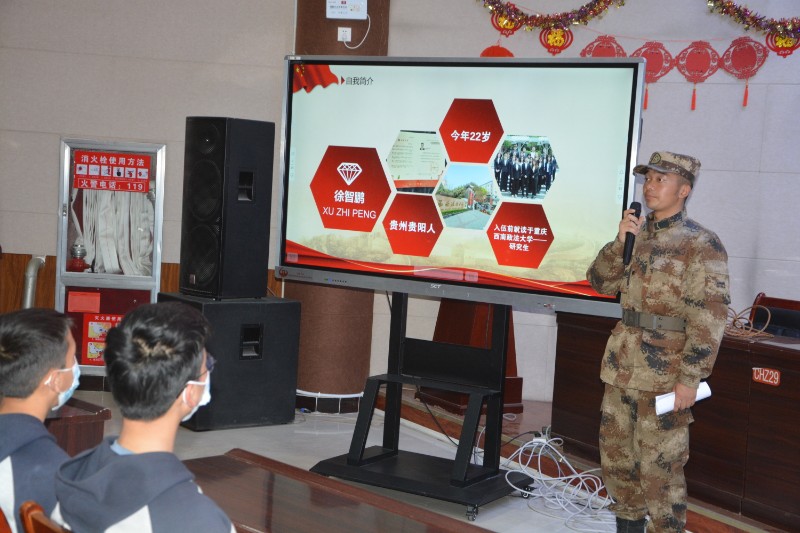 宣讲员徐智鹏从自己对国防教育的认识过程及个人的入伍经历,向同学们讲述了“国无防不立,民无军不安”的道理,他鼓励同学们要满怀初心热枕,努力学习,长大报效祖国。