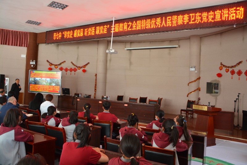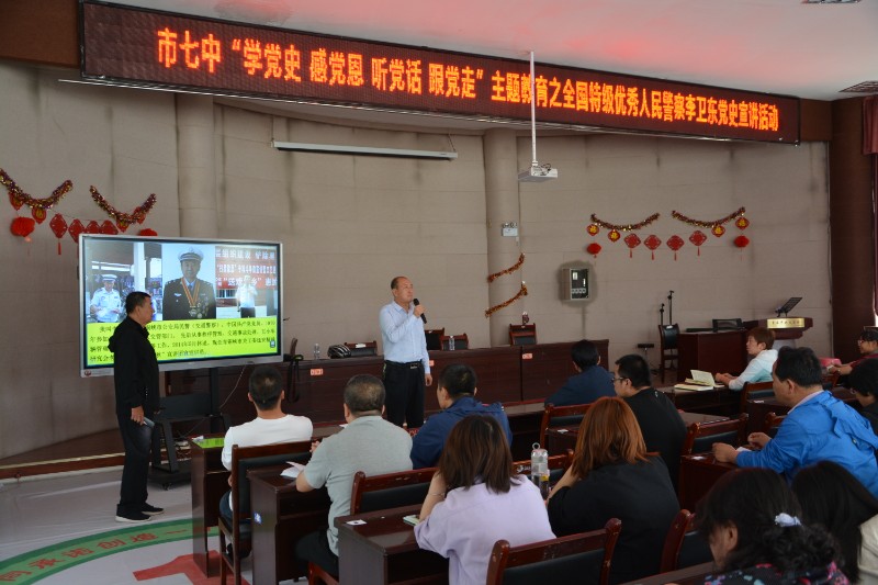 2021年5月26日下午青铜峡市第七中学邀请全国特级优秀人民警察李卫东同志为我校老师和同学们进行了“传播爱党、爱国、爱人民思想”的党史宣讲活动。