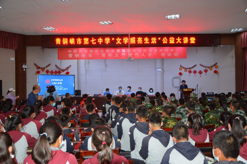 9月15日下午,青铜峡市第七中学名家汇聚,星光璀璨,著名作家季栋梁、漠月、火会亮,青铜峡市本土作家包作军、鲁兴华纷纷走进七中校园,由宁夏文联,宁夏作家协会,吴忠市文联,吴忠市评论家协会,青铜峡市文联,青铜峡市文化馆主办,青铜峡作家之家承办的“文学照亮生活”第22场公益大讲堂暨中国作家协会文学志愿服务示范性重点扶持项目青铜峡市“青年文学创作人才”培训班在青铜峡市第七中学圆满举办。