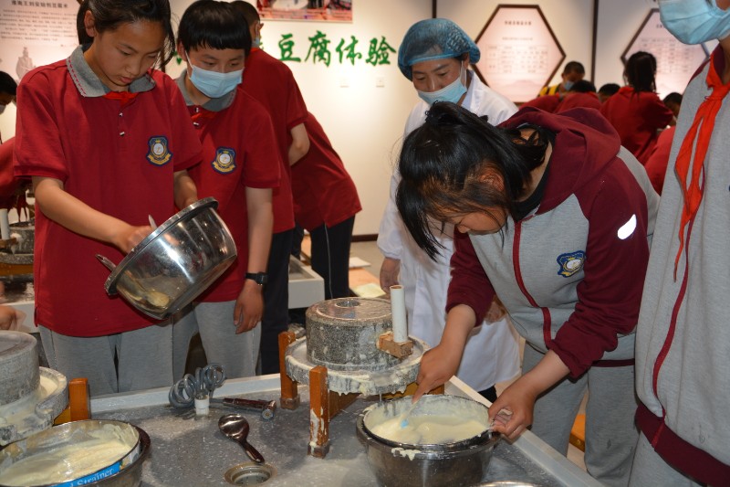 首先组织学生参观了,宁夏兴豆缘豆制品有限公司的豆腐文史馆,了解了中国豆腐制品的发展历史,到现在已有40多个品种。了解了豆腐制品的餐桌文化,了解了古今中外名人、作家、诗人对豆腐制作、豆腐文化、豆腐精神的赞誉。
