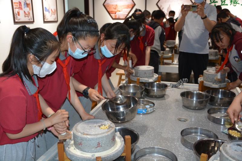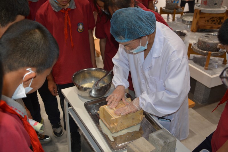 接着在解说员的引领下我们师生来到豆腐体验馆,了解豆腐制品的制作过程,学生们亲自动手完成豆腐制品制作的全过程。品尝劳动成果(喝豆浆、吃豆腐),体验了劳动的快乐。