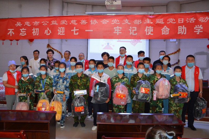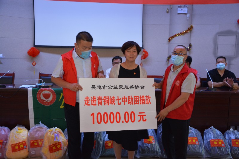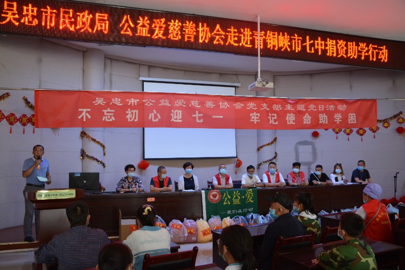 6月30日下午,在七一党的生日来临之际,吴忠市民政局、吴忠市公益爱慈善协会到青铜峡市第七中学(吴忠三中分校)开展了捐助活动,该协会此次捐助活动共捐助市七中30名家庭困难的学生,每名同学捐助善款3百元和书包文具等学习用品,总计10000元,同时由爱心人士王倩捐赠价值3千元的口罩3000只。