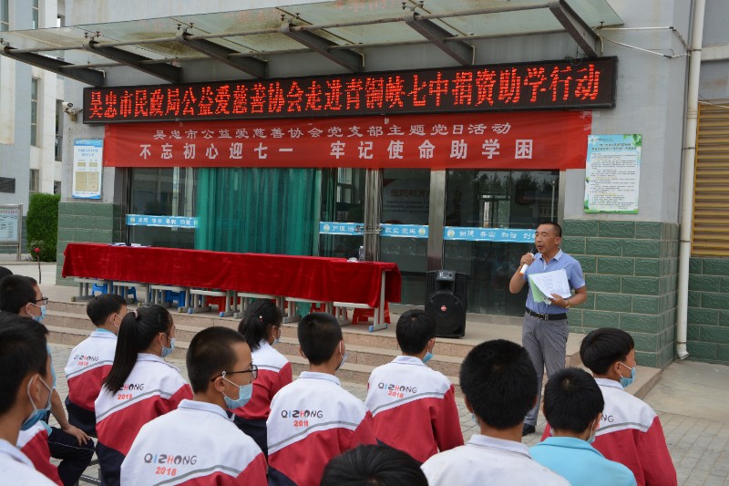 6月30日下午,吴忠市民政局公益爱慈善协会到青铜峡市第七中学开展捐助助学活动。
